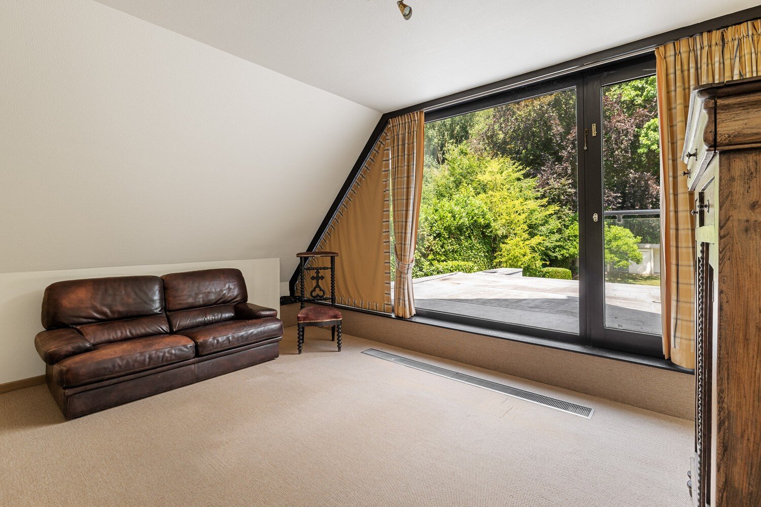 De eerste verdieping telt vier bijkomende slaapkamers, een tweede badkamer met bad, inloopdouche en dubbele lavabo, én een apart toilet. De ruime nachthal biedt bovendien de mogelijkheid om een vaste trap naar de zolder te voorzien. Deze zolder, opgedeeld in twee ruimtes, biedt een prachtig uitzicht op de omgeving en leent zich uitstekend voor het creëren van extra kamers of opslagruimte dankzij de unieke architectuur.