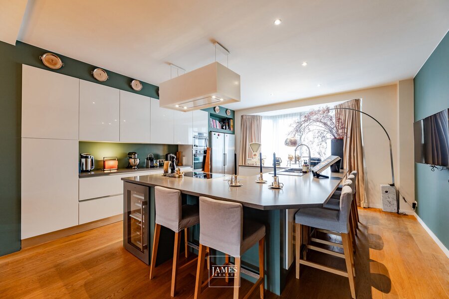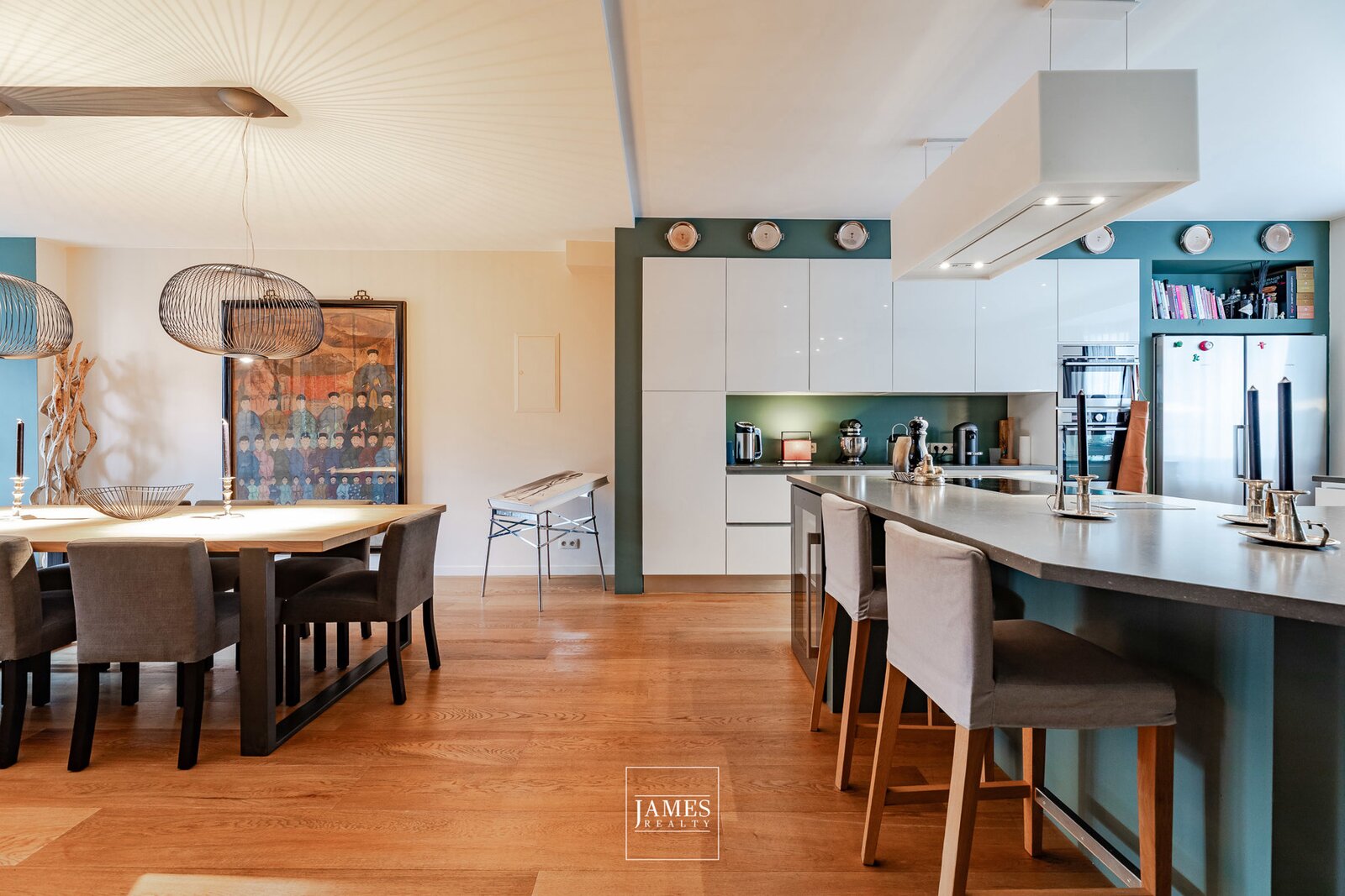Au premier étage, de lumineuses pièces de vie rassemblent une cuisine américaine hyper-équipée, une salle à manger conviviale et un salon avec feu ouvert, le tout prolongé par une agréable terrasse plein sud.