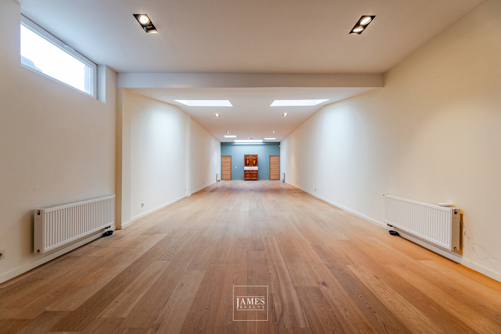 Le rez-de-chaussée accueille un vaste garage (pour une à deux voitures) servant également de hall d’entrée, ainsi qu’un grand espace polyvalent de +/-100m2 — idéal bureau, family room ou chambre d’appoint — avec toilette et salle de douche.