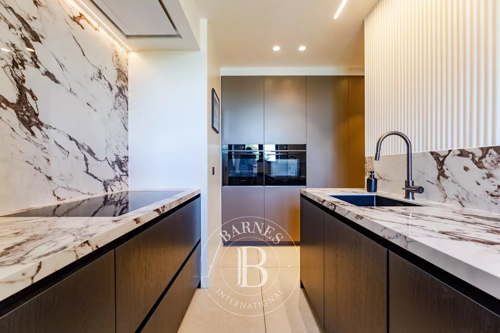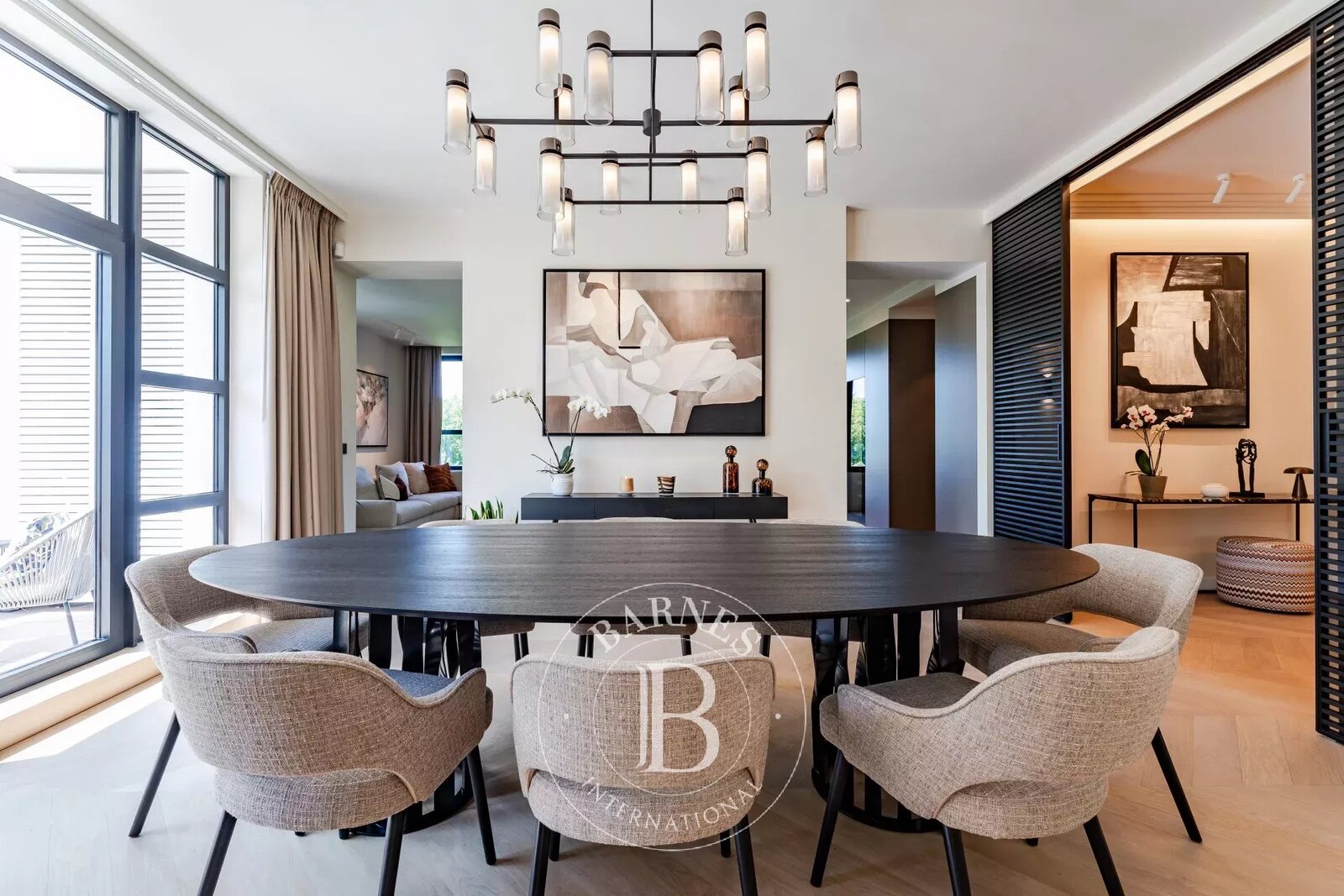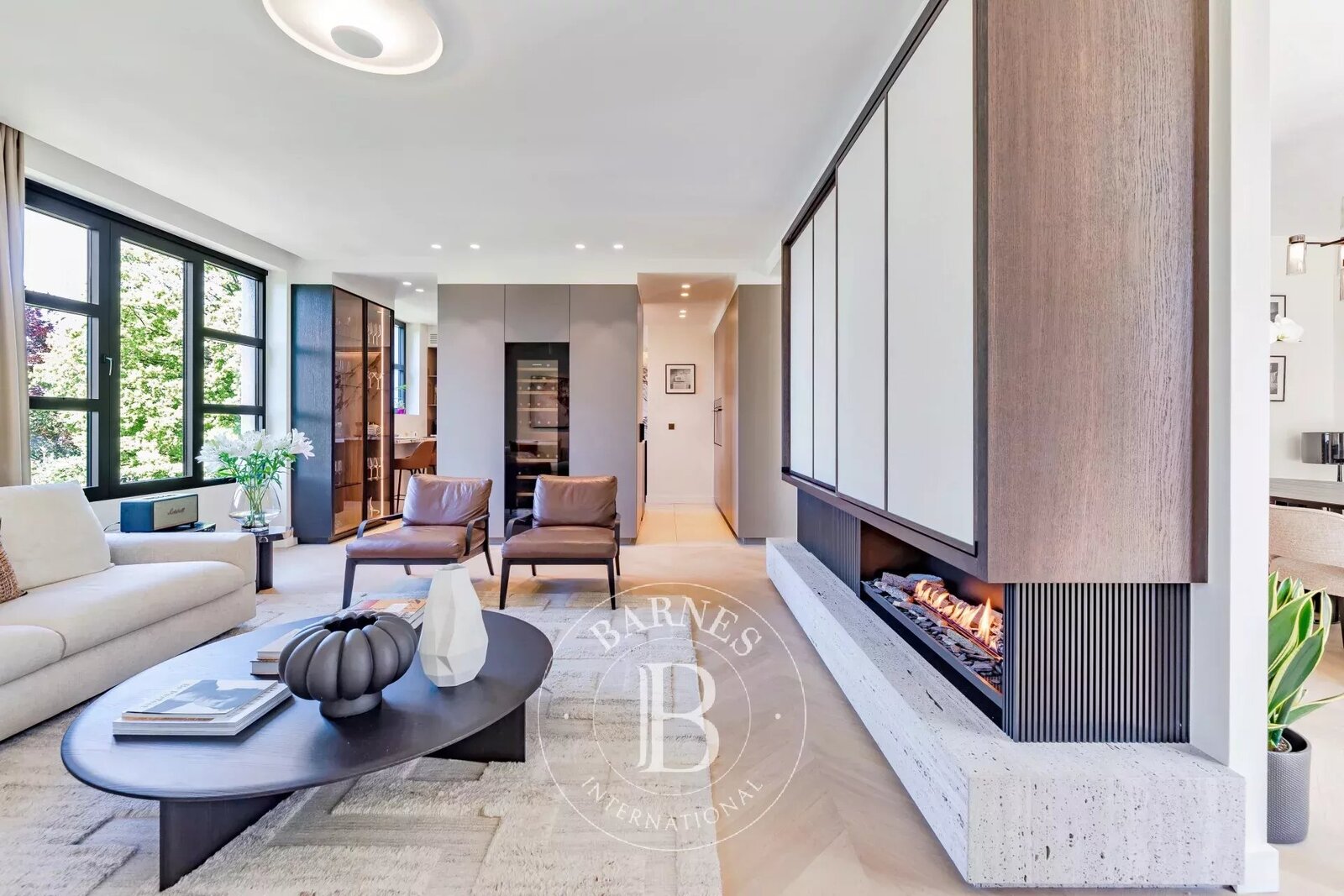 Un grand hall d'entrée avec vestiaire et toilette invités, un spacieux salon avec feu ouvert et bar intégré, une belle salle à manger lumineuse avec un accès à une très belle terrasse de 15m2 idéalement orientée Sud-ouest avec une vue arborée, une cuisine semi-ouverte hyper équipée (de marque italienne haut de gamme Binova Cucine).