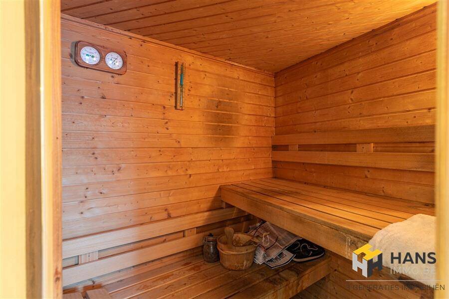 Al bij het binnenkomen merk je het oog voor detail aan de toegangsdeur met raampje in organische vorm en de bovengelegen dakkoepel. Links ga je de vestiairehoek en gastentoilet voorbij en vervolgens de aparte keuken met aangrenzende eethoek (23 m²) met zicht op de tuin. De blikvanger van de woning is ongetwijfeld de lichtrijke leefruimte (54 m²) met grote raampartijen, centraal geplaatste spiltrap en gashaard. Als ondergrond ligt er een onderhoudsvriendelijke betonnen gietvloer. Ook op het gelijkvloers bevindt zich de masterbedroom (30 m²) met ingemaakte kasten en aangrenzende badkamer met sauna. Wanneer je de wenteltrap naar boven neemt, bereik je de eerste 2 slaapkamers van 11 m² en 15 m² en de tweede badkamer (5 m²). De laatste slaapkamer (18 m²) is te vinden op de bovenverdieping, in de nok van het lessenaarsdak.