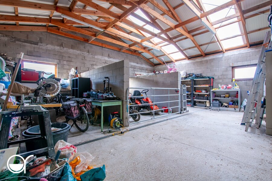 Via een lange kasseiweg kan men het erf oprijden tot aan de ruime parking. De loods van 200m2 bezit 2 garagepoorten zodat men daar ook overdekt kan parkeren. Er is een laadpaal voorzien. In een 2e deel van de loods is er extra berging of plaats voor het houden van dieren.