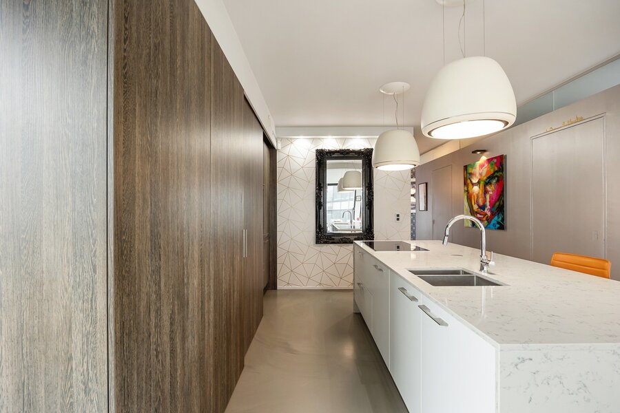 Initialement conçu avec deux chambres, le loft a été réaménagé en une spacieuse suite parentale avec salle de bain intégrée, dressing sur mesure et placards encastrés. Une pièce séparée convient parfaitement comme bureau, chambre d’amis ou espace de rangement. Le séjour respire l’espace et la lumière, avec ses hauts plafonds, ses grandes baies vitrées équipées de stores solaires et sa cuisine ouverte en noyer avec plan de travail en quartz composite, entièrement équipée d’appareils Bauknecht et d’un lave-vaisselle Miele. La salle de bain offre un confort luxueux avec une douche à l’italienne et une baignoire à jets whirlpool. Une buanderie séparée et un espace de stockage complètent l’ensemble.