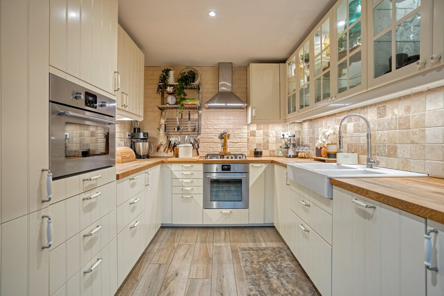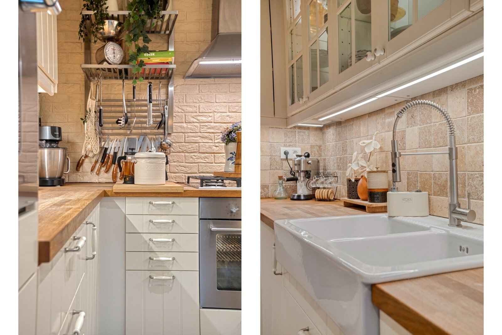 De keuken is volledig uitgerust met kwalitatieve inbouwapparatuur waaronder een gaskookplaat, afzuigkap, combi-oven, combi-stoomoven, vaatwasser en koelkast.
