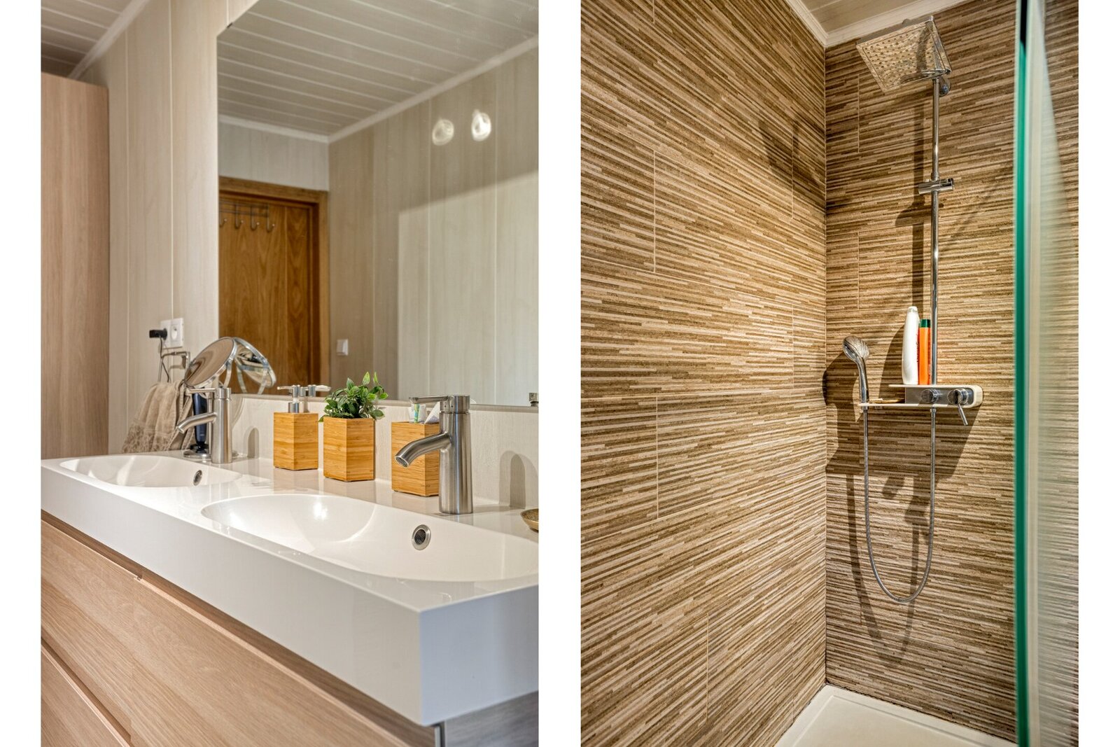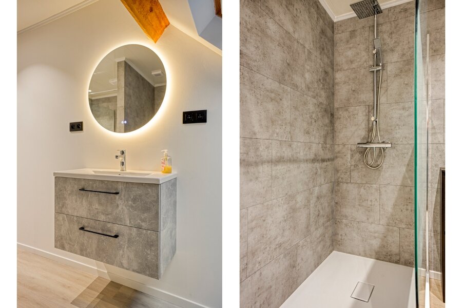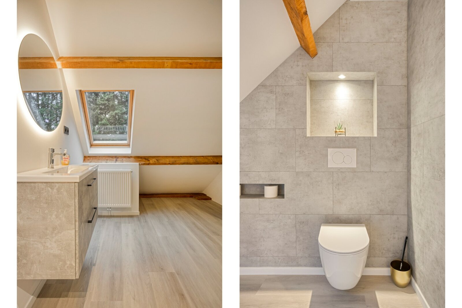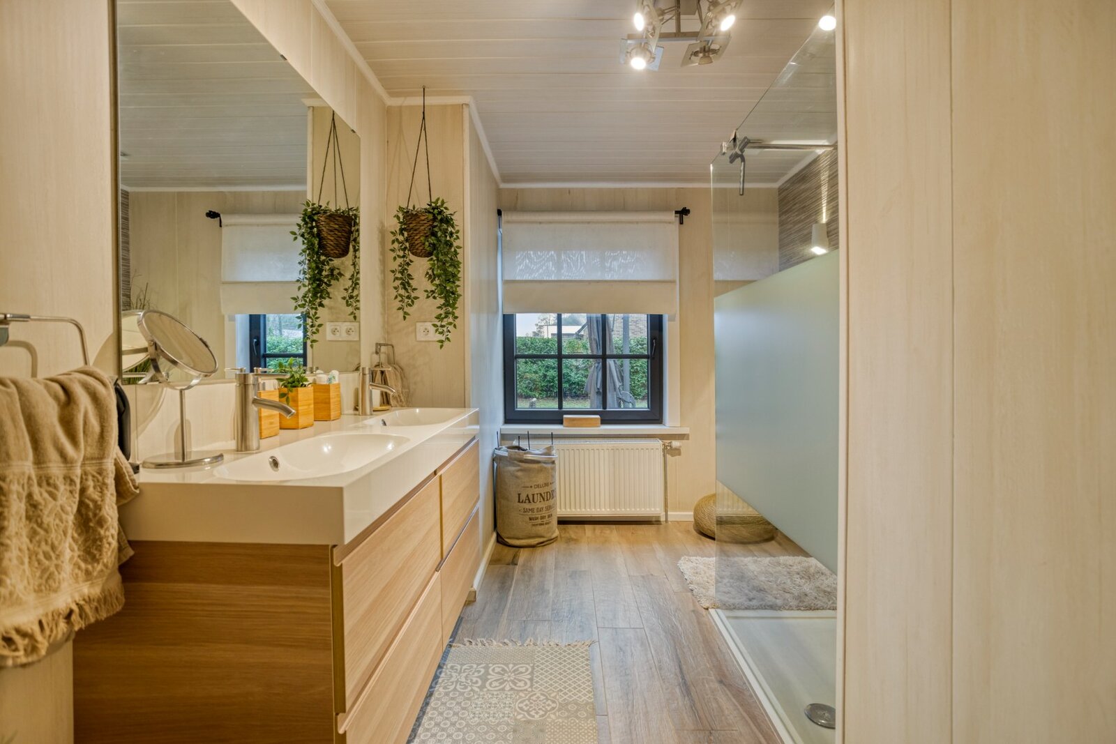 De nachthal op het gelijkvloers biedt toegang tot drie slaapkamers, het gastentoilet en de ruime badkamer, welke voorzien is van een inloopdouche en dubbele wastafel in meubel.