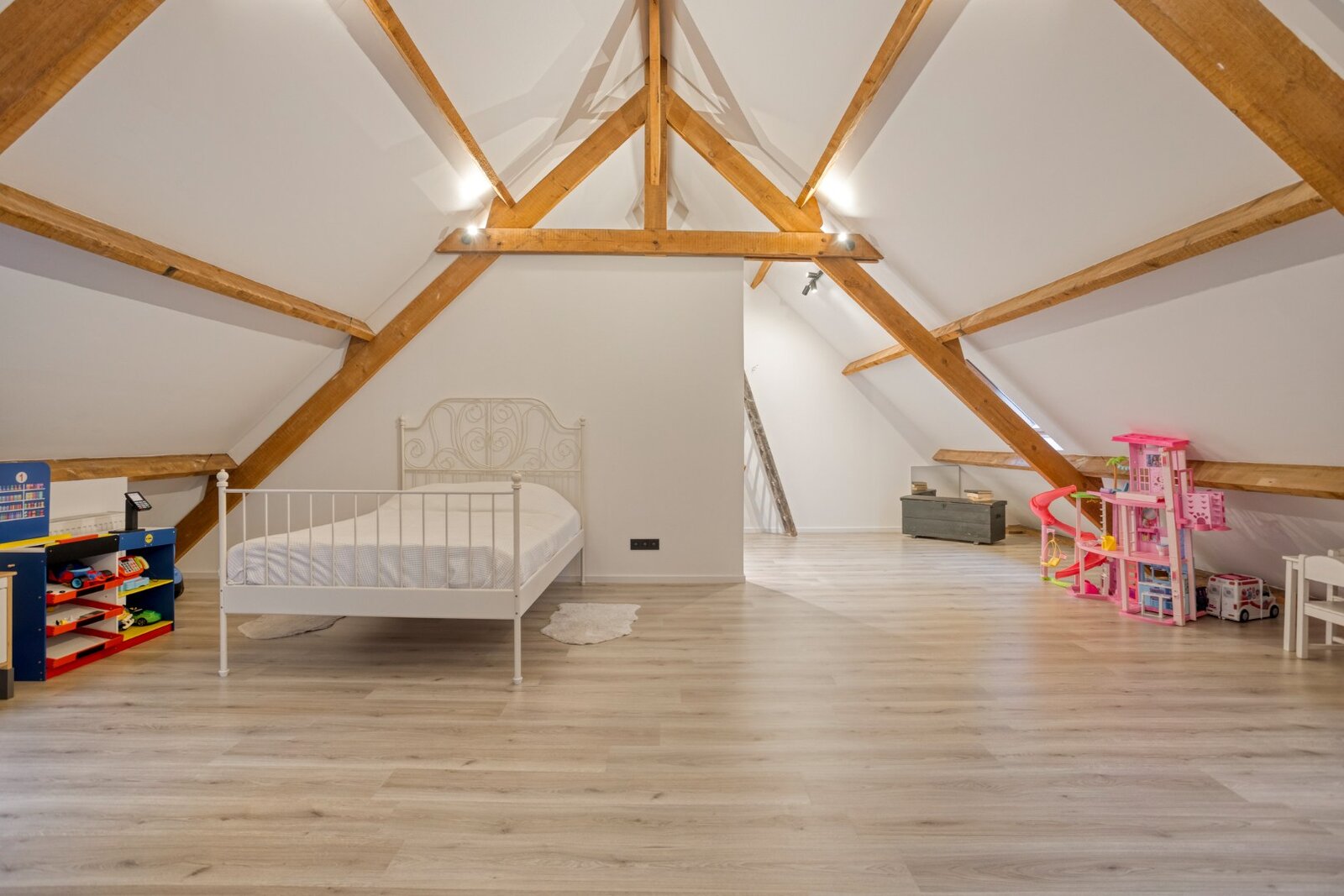 Via een vaste trap betreed je de verdieping met vide, gezellige lounchehoek en studio/ loft. Deze gezellige ruimte van ca 68 m² kan ingedeeld worden als vierde luxe slaapkamer met ruimte voor een zithoek en is voorzien van een ensuite badkamer met inloopdouche, toilet en wastafel.