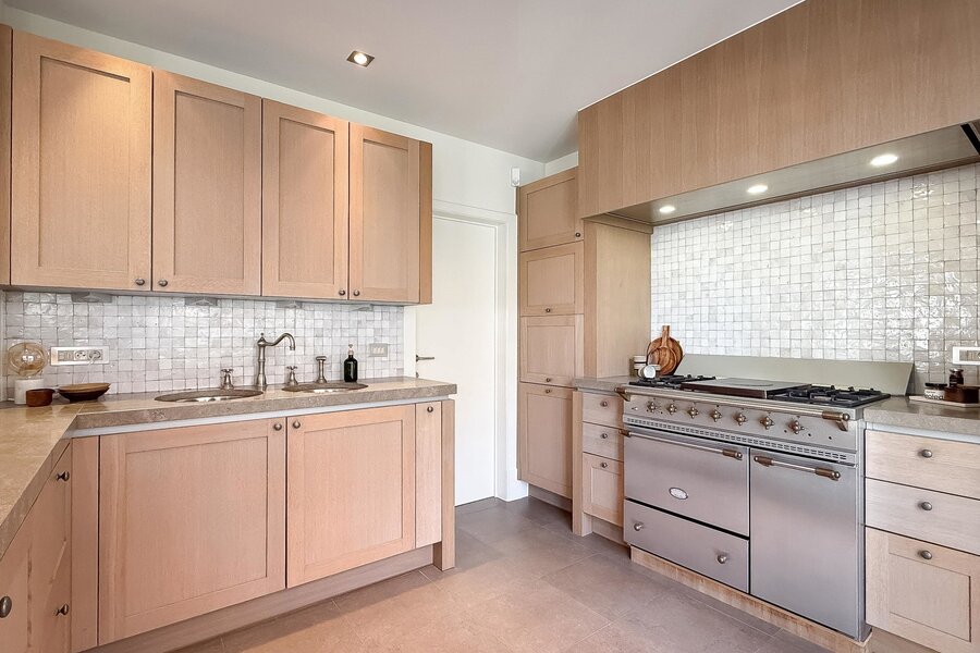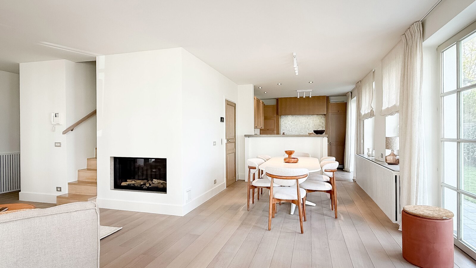 Le hall d’entrée avec vestiaire et toilette invités mène vers un lumineux séjour avec feu ouvert et coin café, donnant accès à une spacieuse terrasse avec vue mer panoramique. La salle à manger s’intègre harmonieusement à la cuisine ouverte moderne, réalisée avec des matériaux de qualité et équipée de tout le confort contemporain.