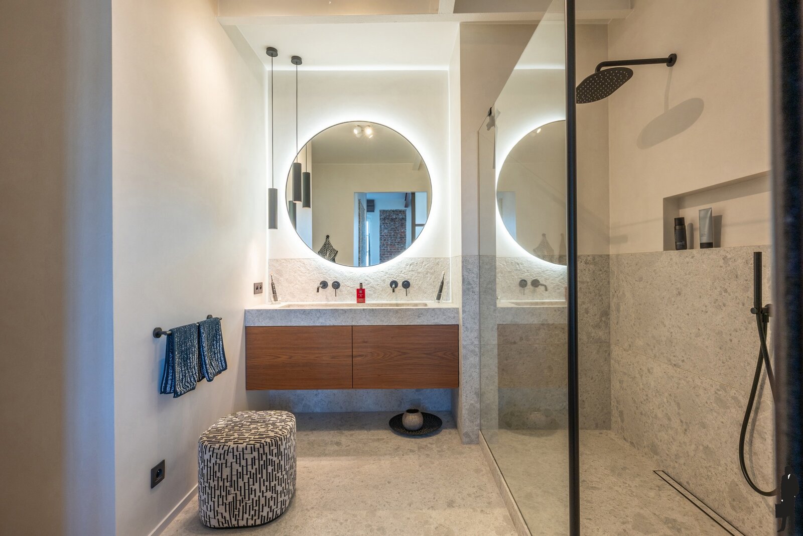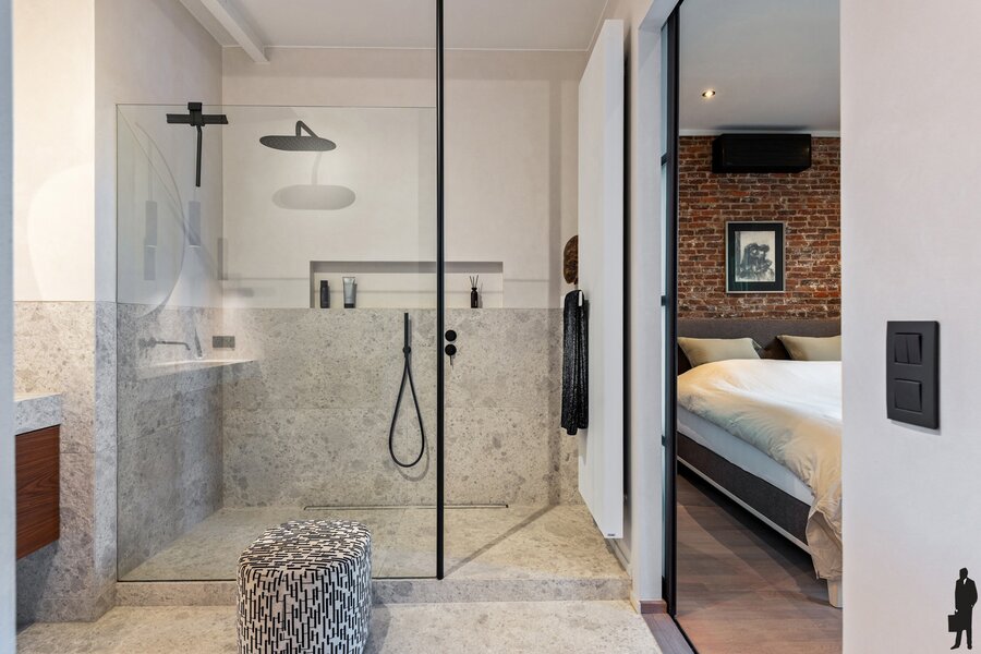 - Master bedroom met ensuite dressing en badkamer met ruime inloopdouche en dubbele lavabo, Italiaanse natuursteen en Mortex