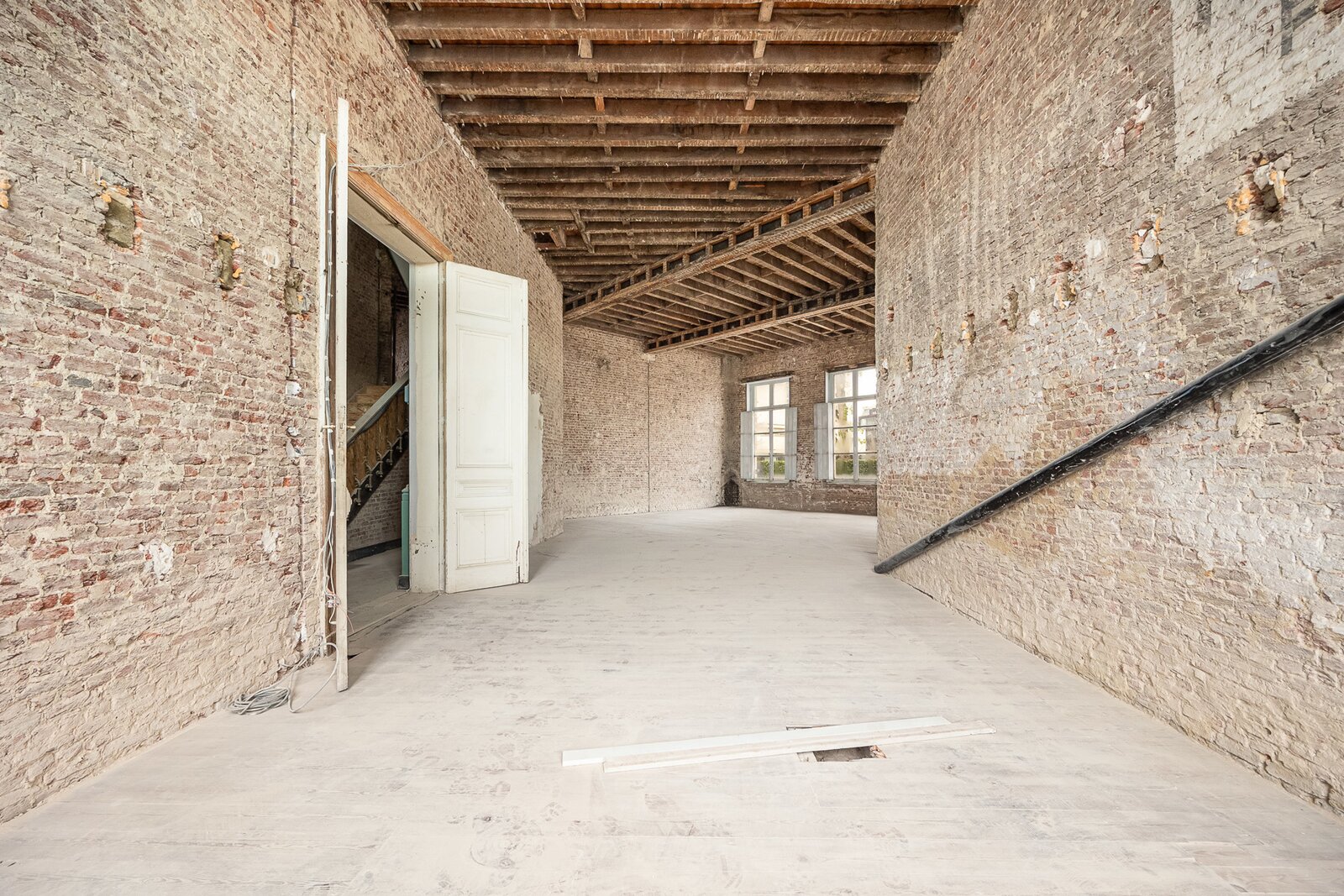 Une double porte donne accès à la volumineuse maison de maître qui s'étend jusqu'à la rue arrière. Les pièces se caractérisent par de hauts plafonds et des fenêtres communicantes offrant une vue frontale sur l'Escaut.