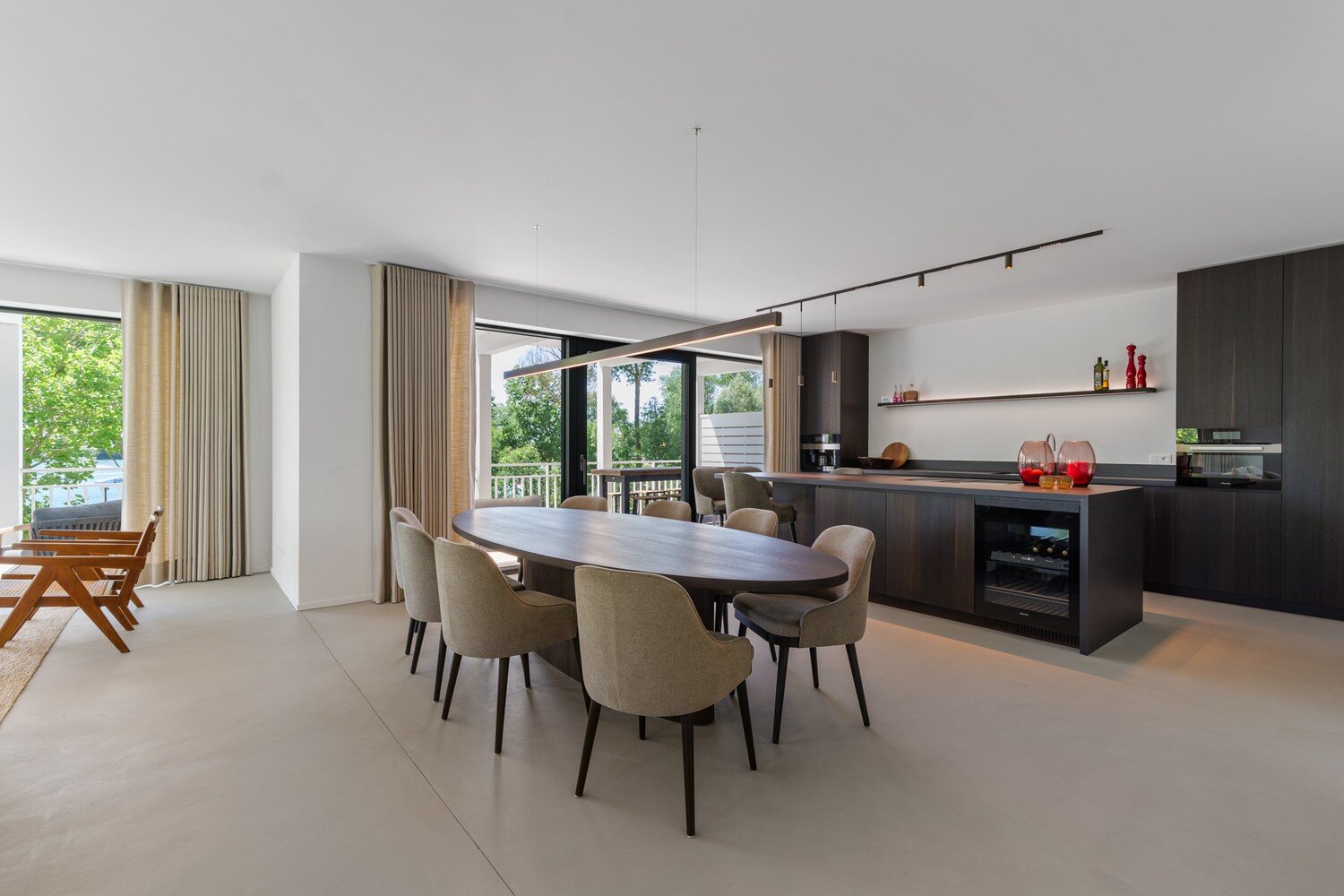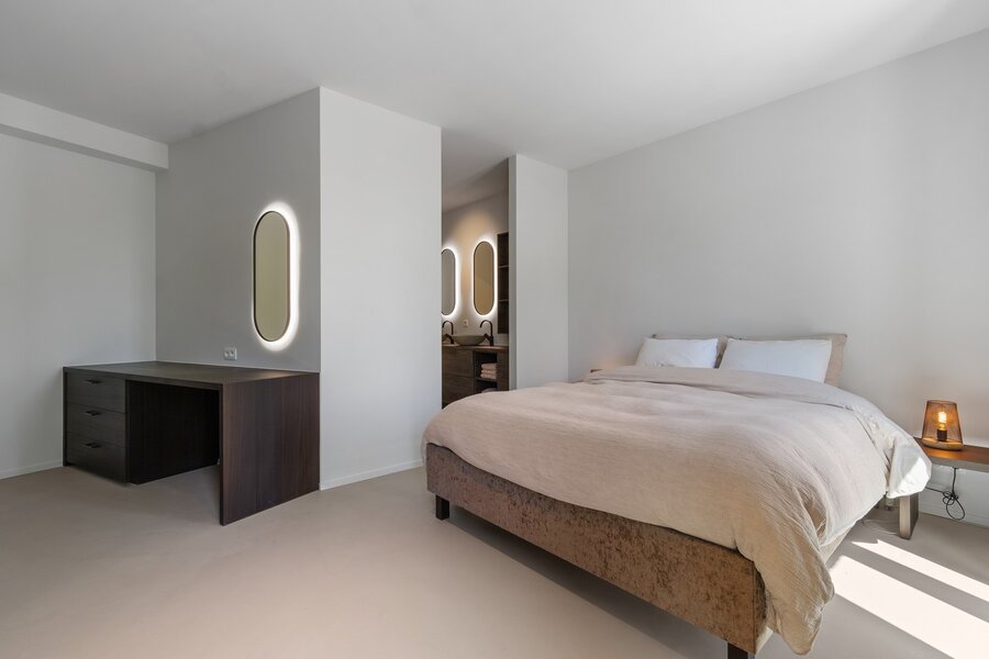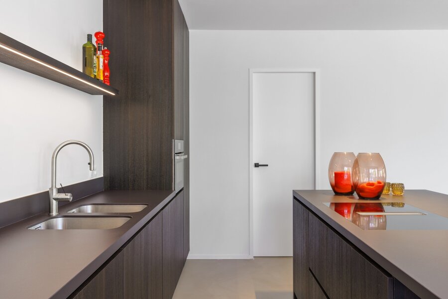 De leefruimte is bijzonder licht en open, met grote raampartijen die zorgen voor een overvloed aan natuurlijk daglicht en een naadloze verbinding met de terrassen. De open keuken sluit hier perfect op aan en is volledig uitgerust met alle hedendaagse inbouwtoestellen. Hier werd gekozen voor hoogwaardige materialen en een strak design dat comfort en luxe uitstraalt. Verder geniet u van een praktische bergruimte die voldoende plaats biedt.