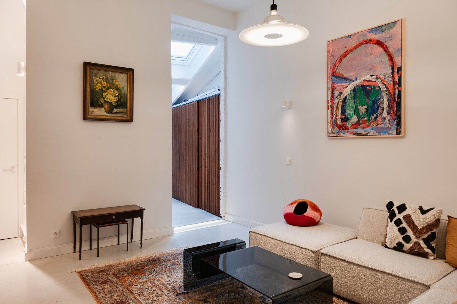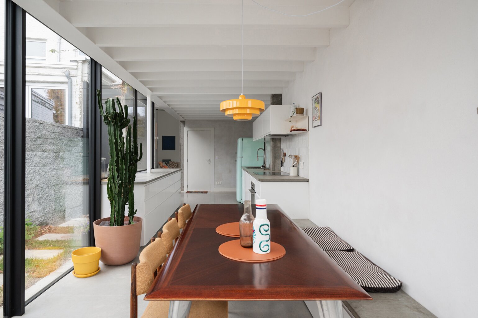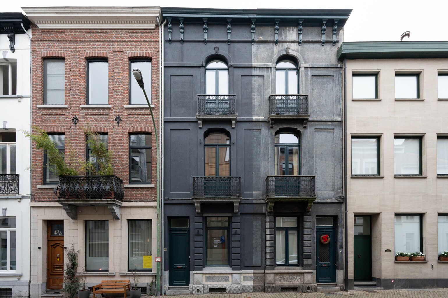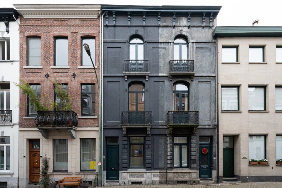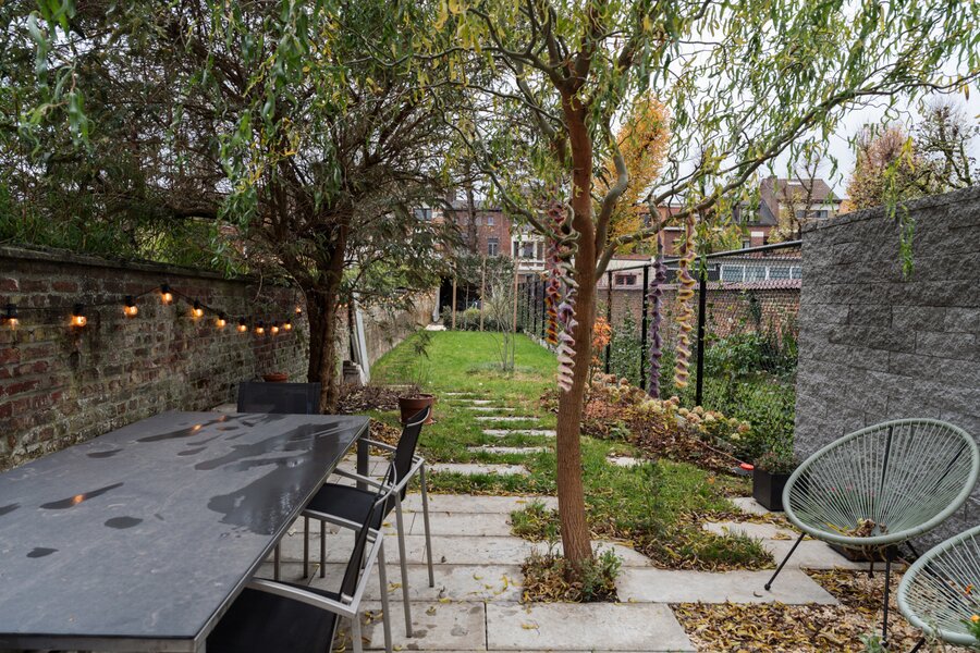 La façade bleu nuit, élégante et raffinée, l’annonce déjà : derrière celle-ci se cache une maison pleine de style. À l’intérieur, remarquez les éléments protégés soigneusement préservés, les rosaces authentiques, les hauts plafonds qui créent un beau volume, ainsi que l’aménagement intérieur particulièrement soigné.