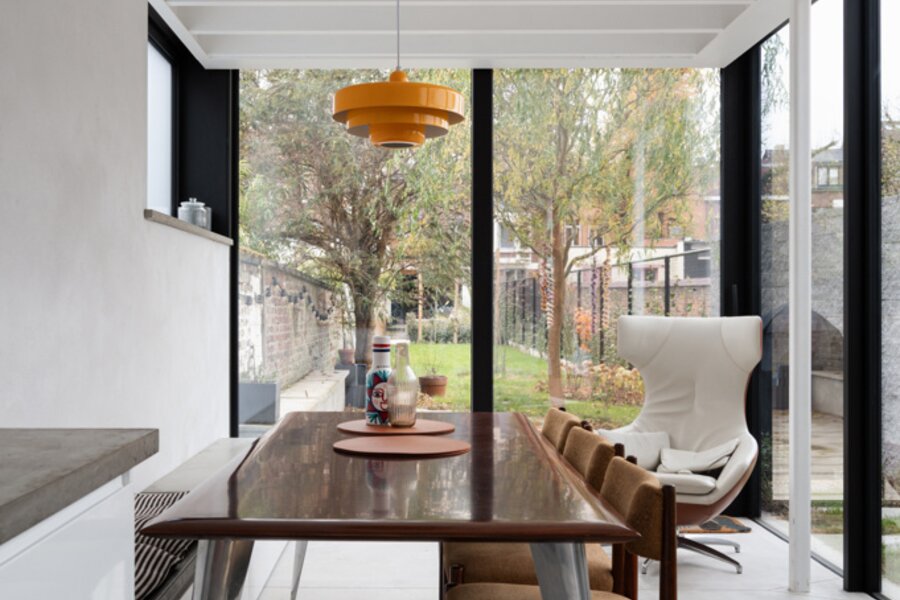 Le rez-de-chaussée dispose d’un sol coulé, d’un chauffage par le sol et, à l’avant droite, d’un espace pouvant servir de cabinet, bureau, salle de jeux ou zone détente. Ensuite viennent le salon et, à l’arrière, la cuisine ouverte donnant sur la pièce de vie, dotée de nombreuses baies vitrées qui laissent entrer une abondance de lumière naturelle. Le jardin urbain, magnifiquement aménagé et profond, comprend deux terrasses et un garage au fond de la parcelle – un lieu de rêve pour les enfants, les fêtes inoubliables dans le jardin ou les soirées d’été qui n’en finissent jamais…