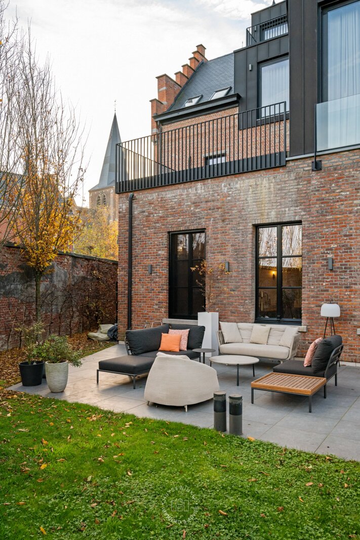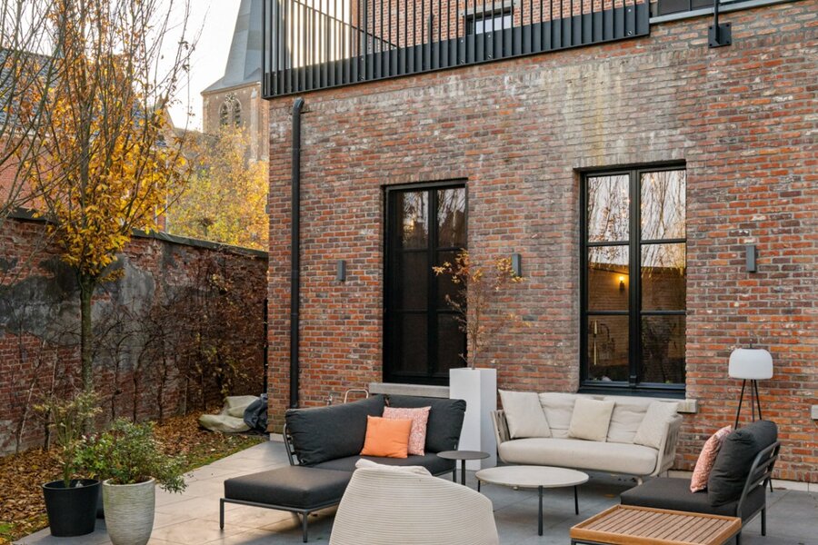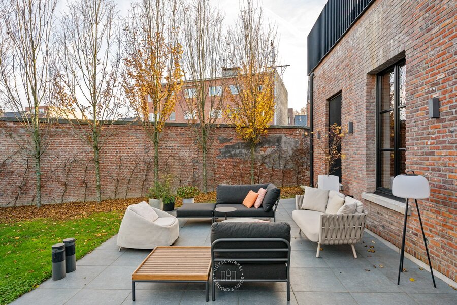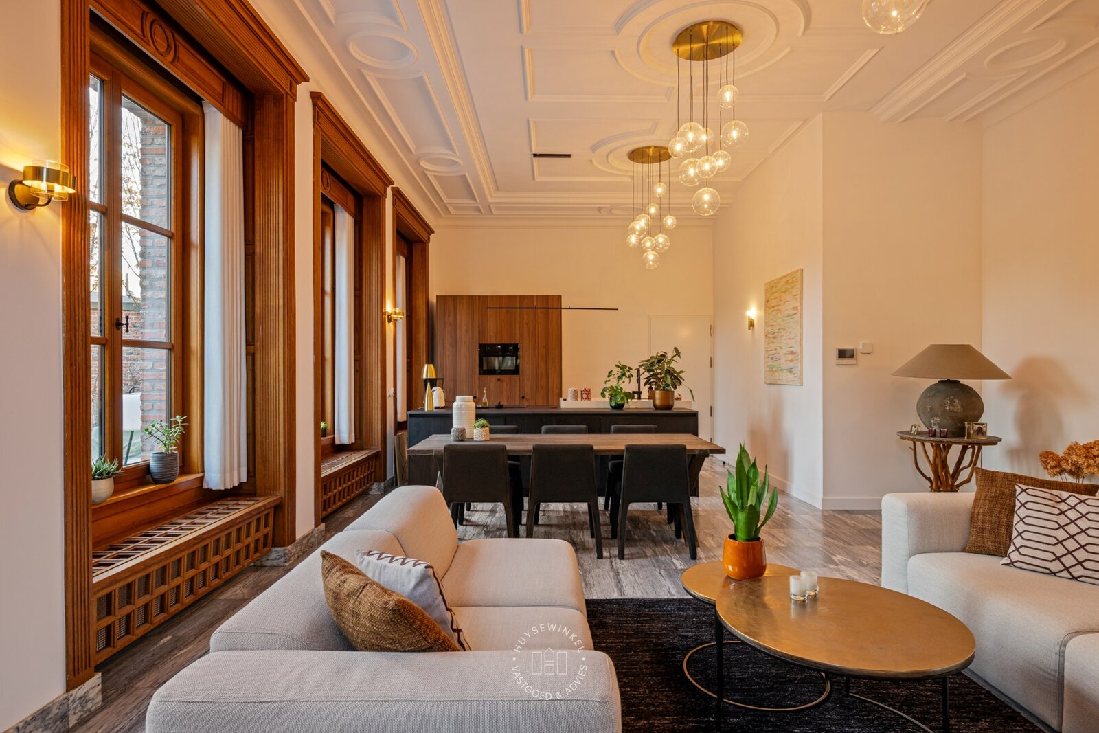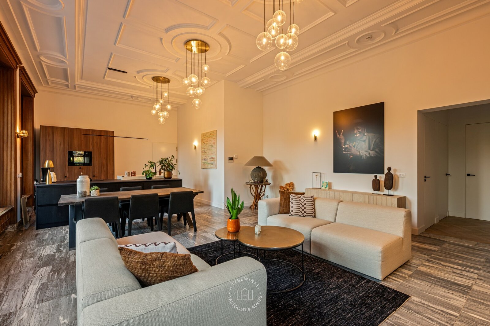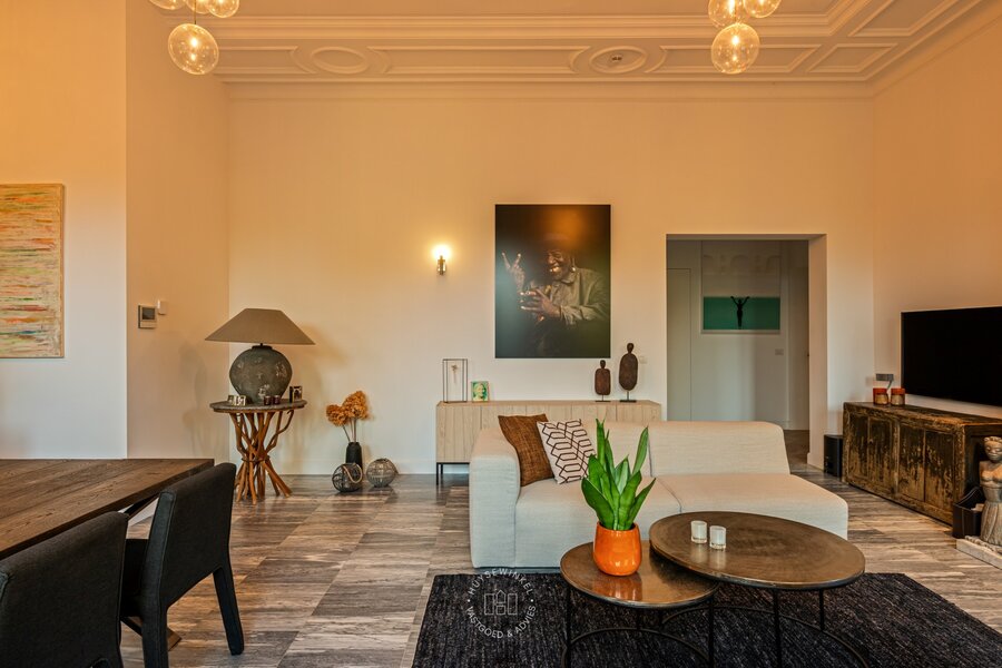 Bij binnenkomst springen de 4 meter hoge plafonds met verfijnde moulures meteen in het oog. Ze creëren een uitzonderlijk gevoel van ruimte en luxe in de volledige leefzone. De open indeling met keuken, eetkamer en leefruimte vormt het warme hart van het appartement. Grote raampartijen zorgen voor een overvloed aan natuurlijk licht en bieden een direct zicht op de privatieve tuin met ruim terras – een zeldzame troef die zorgt voor een ongeëvenaarde woonervaring.