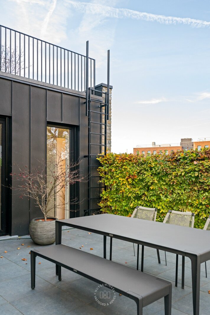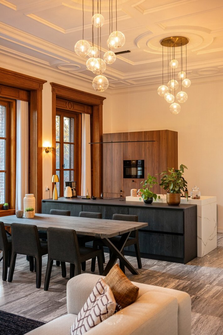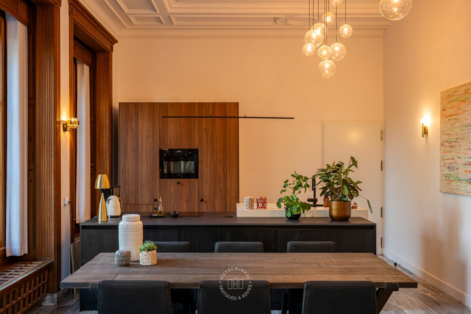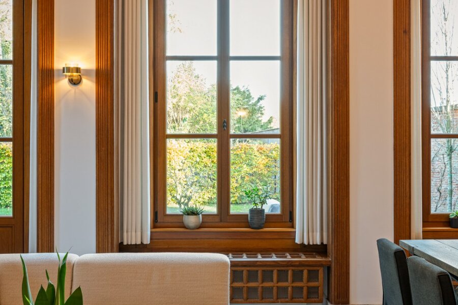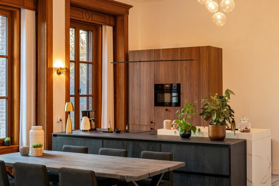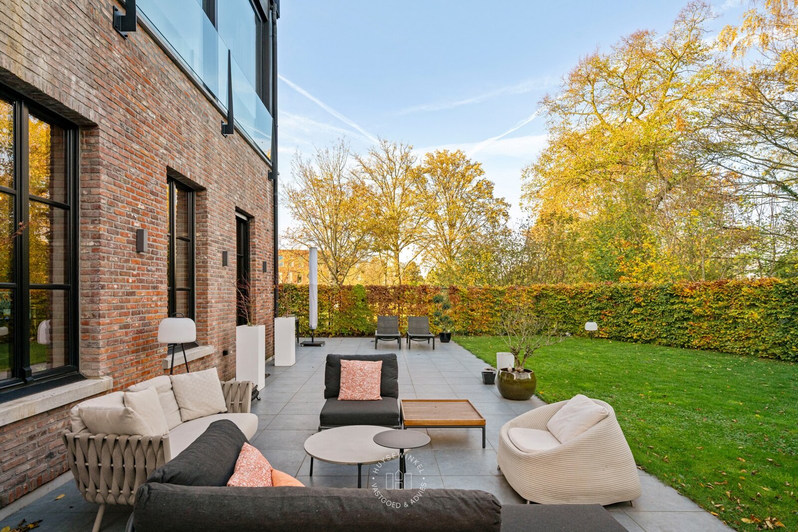 Bij binnenkomst springen de 4 meter hoge plafonds met verfijnde moulures meteen in het oog. Ze creëren een uitzonderlijk gevoel van ruimte en luxe in de volledige leefzone. De open indeling met keuken, eetkamer en leefruimte vormt het warme hart van het appartement. Grote raampartijen zorgen voor een overvloed aan natuurlijk licht en bieden een direct zicht op de privatieve tuin met ruim terras – een zeldzame troef die zorgt voor een ongeëvenaarde woonervaring.
