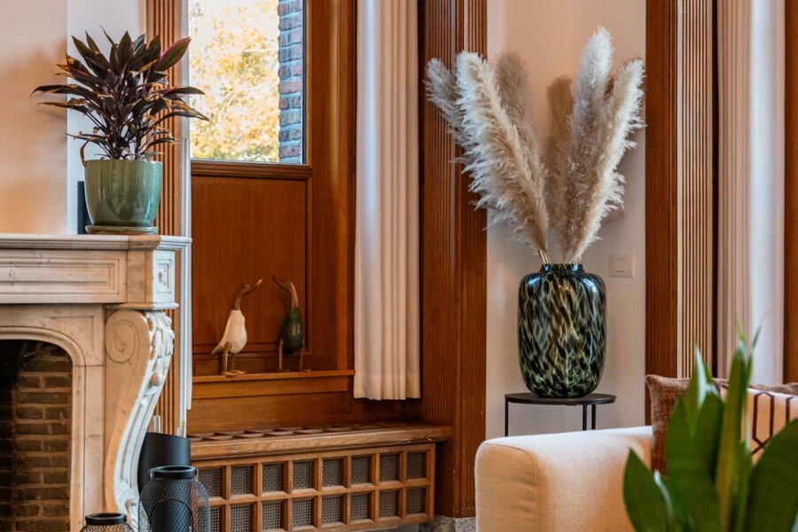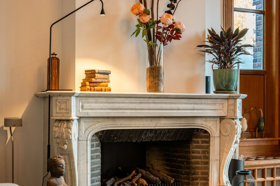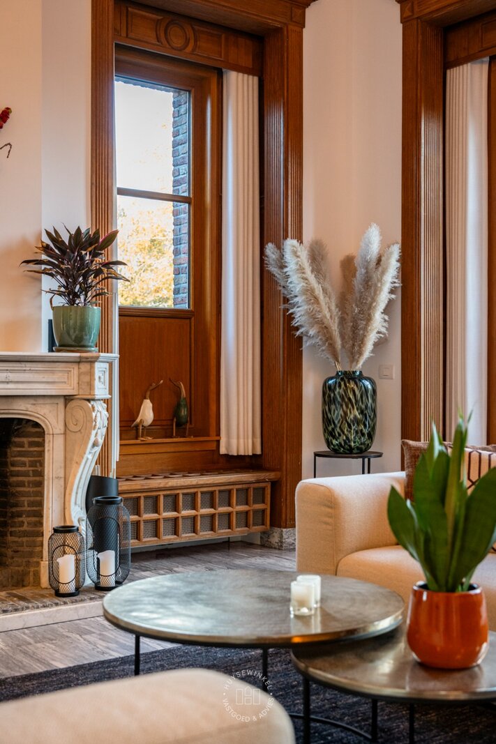De natuurstenen vloeren, houtaccenten en de marmeren schouw benadrukken de authentieke charme, gecombineerd met moderne afwerking en comfort.