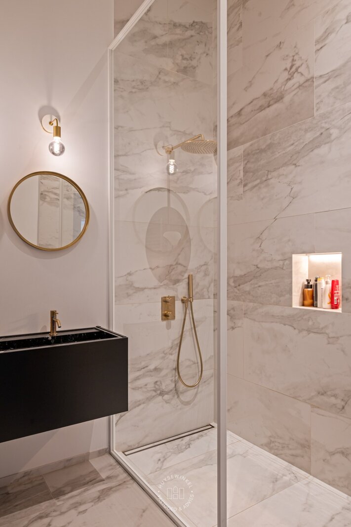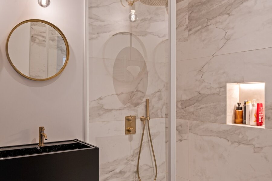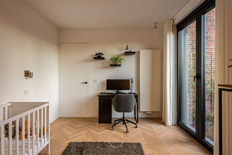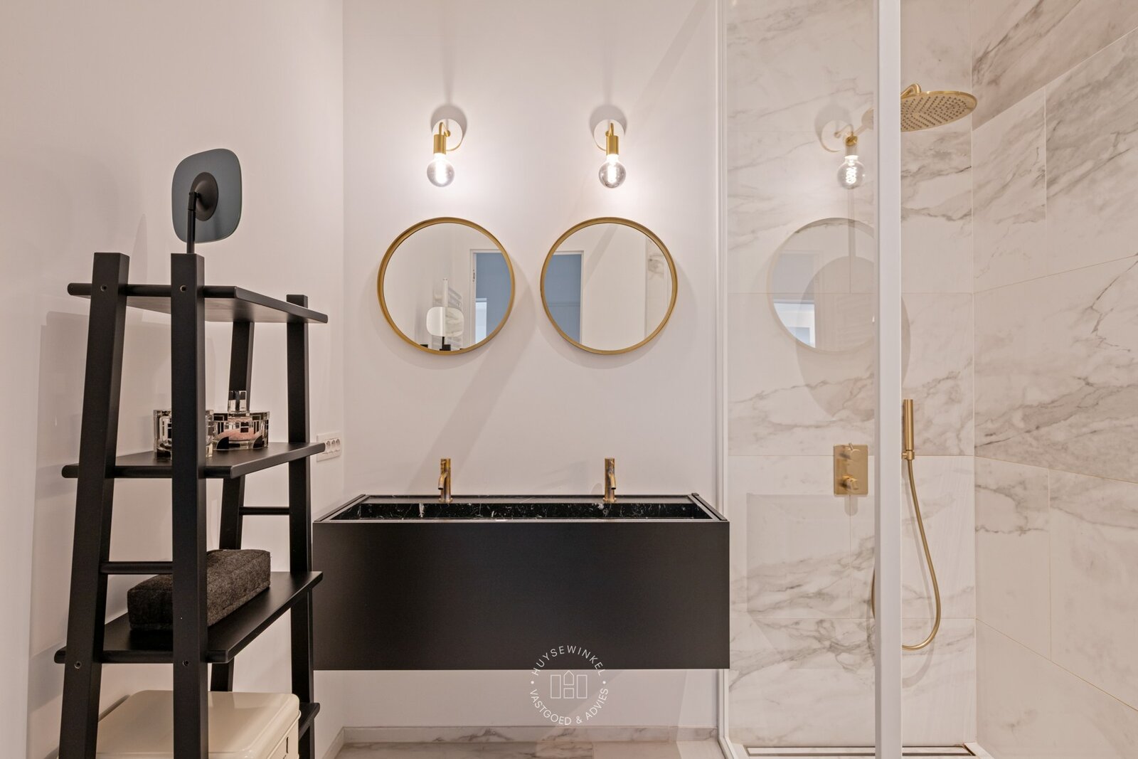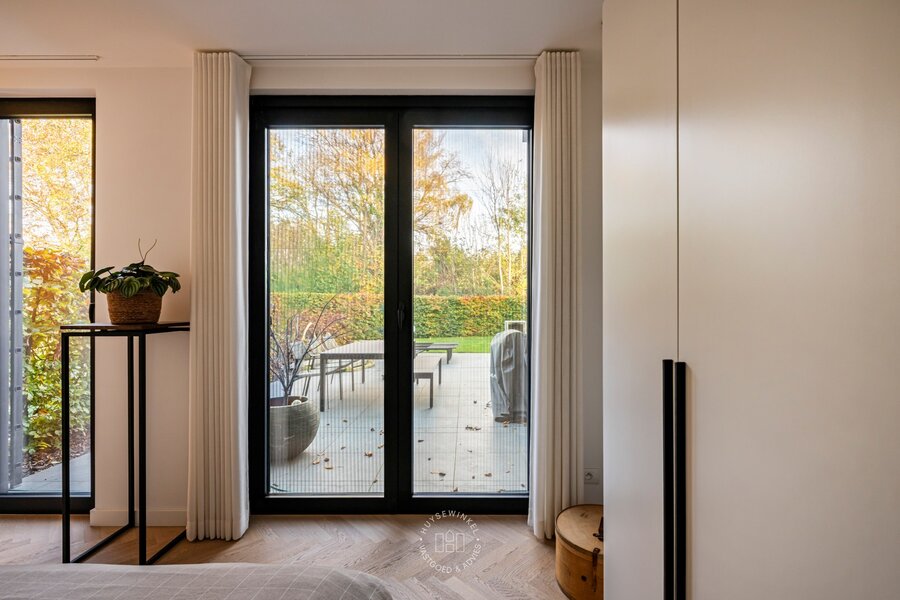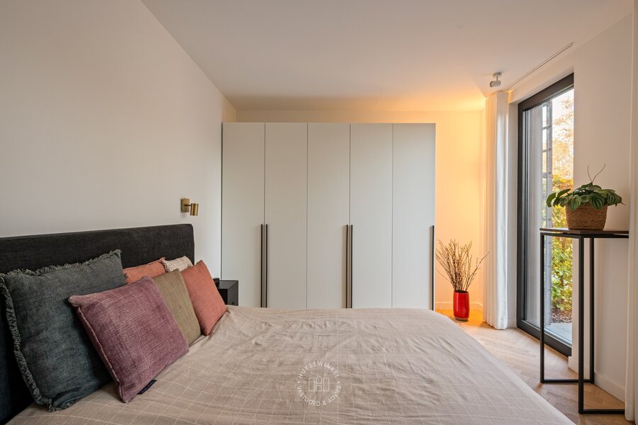 Via de centrale hal bereikt u de twee ruime slaapkamers, beiden afgewerkt met eiken visgraatparket en voorzien van toegang tot buitenruimte. Verder bevinden zich hier de stijlvolle badkamer in marmer met inloopdouche en lavabomeubel, een apart toilet en een praktische berging.