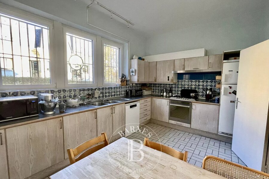 Au rez-de-chaussée, un hall d’entrée, une toilette invités, un vestiaire, un bureau, de belles réceptions lumineuses avec feu ouvert (72m2) donnant accès à une belle terrasse et un superbe jardin orienté Sud-Est, une cuisine séparée avec une arrière cuisine et enfin, une grande chambre de 19m2 avec sa salle de bains attenante.