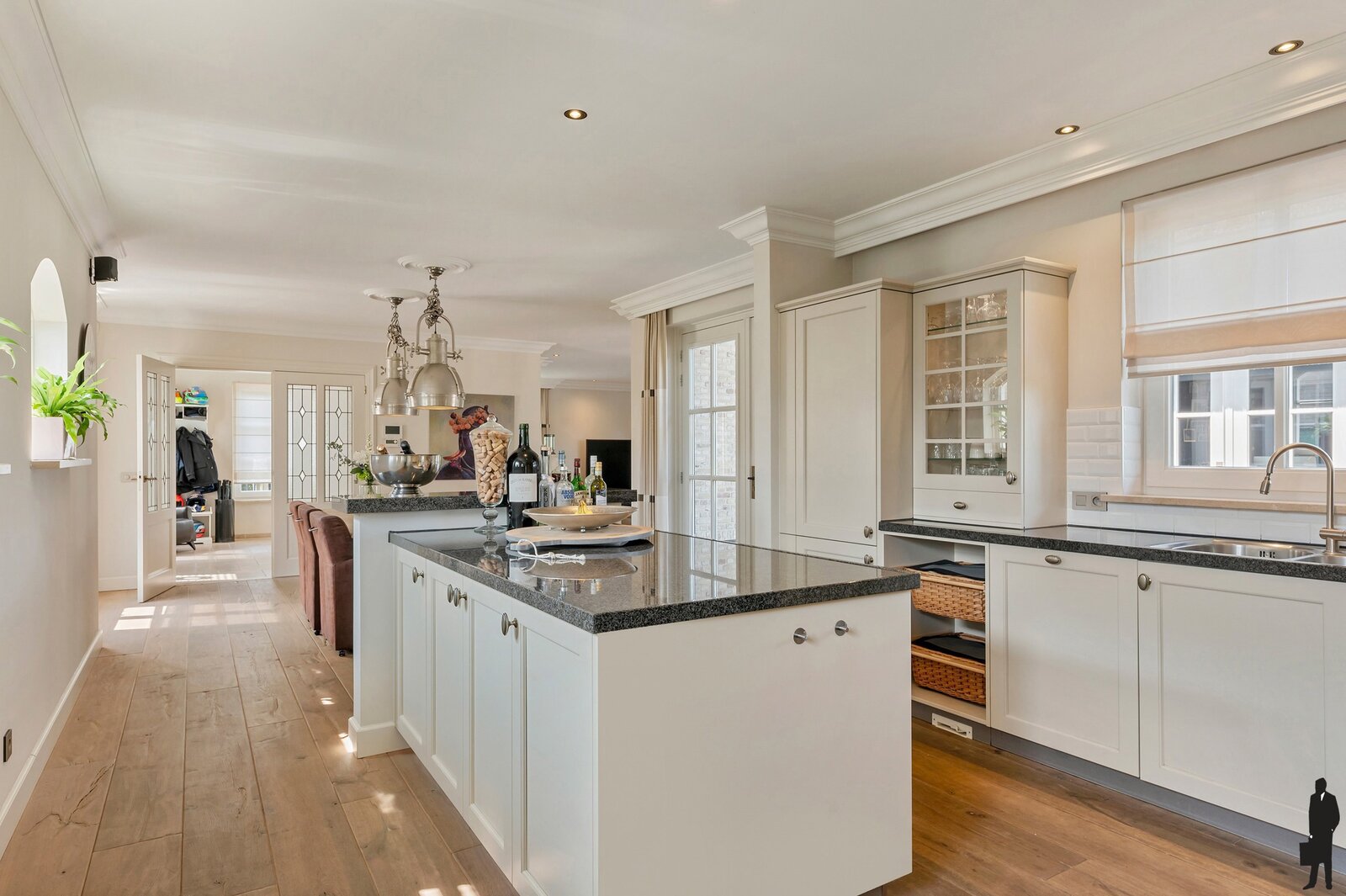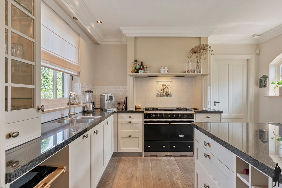Luxe open keuken met kookeiland en voorzien van kwaliteit inbouwapparatuur.