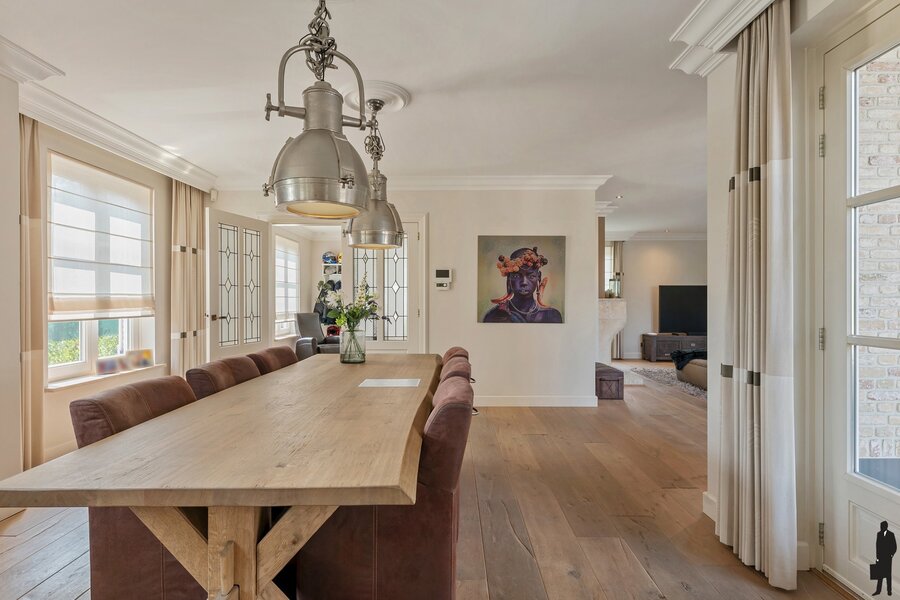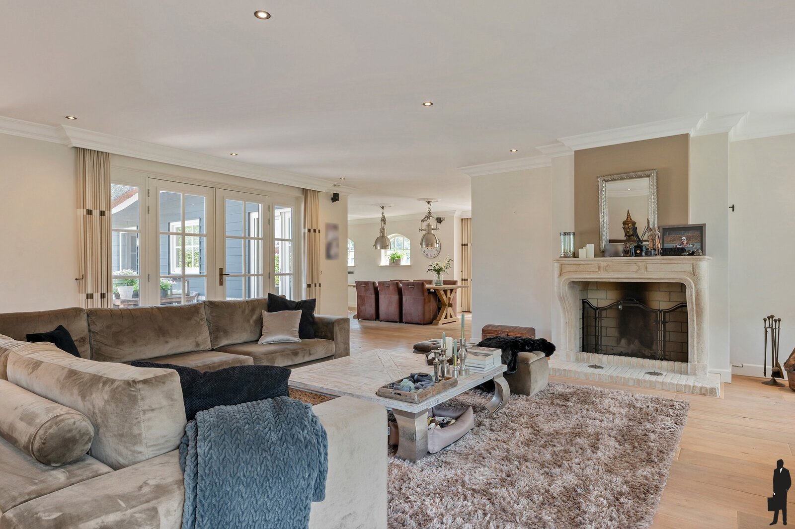 Ruime entree met trapopgang en gastentoilet. Lichte ruime woonkamer met openslaande deuren en voorzien van open haard.