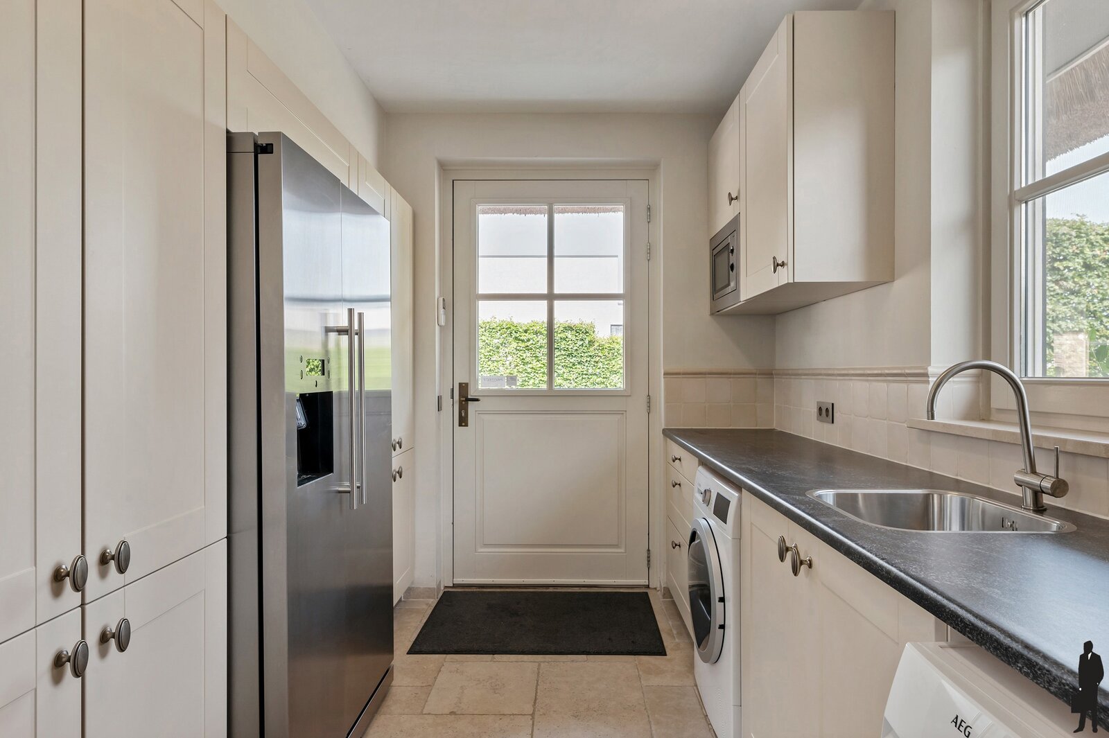 Aangrenzend aan de keuken is er een praktische bijkeuken met deur naar de tuin.