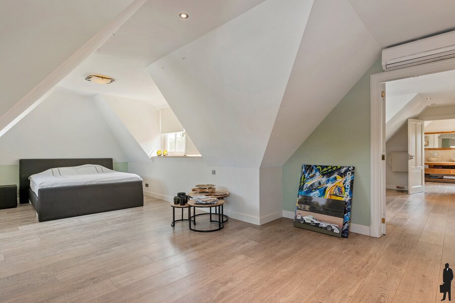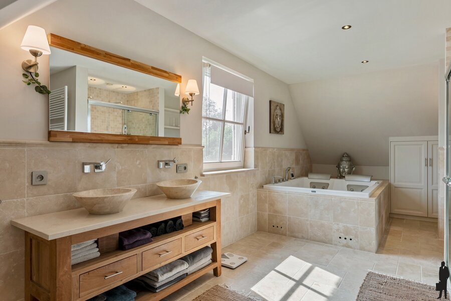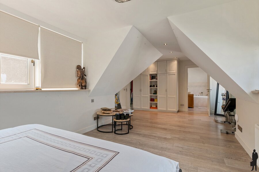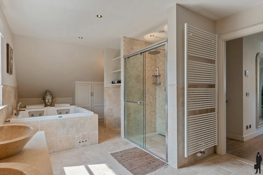 Masterbedroom met dressing en eigen badkamer voorzien van jacuzzi, toilet, dubbele wastafel en inloopdouche.