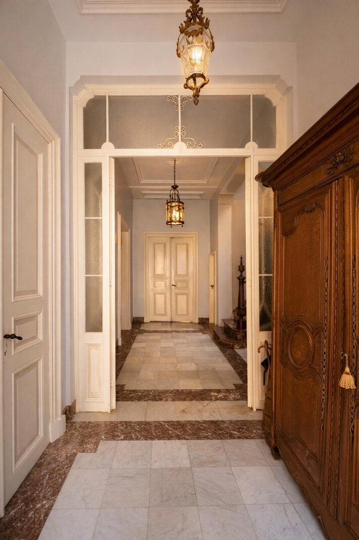 Bij het betreden van dit pand wordt u omarmd door een gevoel van grandeur: een kenmerkend trappenhuis, rijk gedetailleerde salons met lijstwerk, verfijnde lambriseringen en prachtige marmeren schouwen allen ontworpen door de gerenommeerde architect I. Alleweireldt (1824-1892). Dit is een woning die een statement maakt: groots in uitstraling en luxueus in elk authentiek detail.