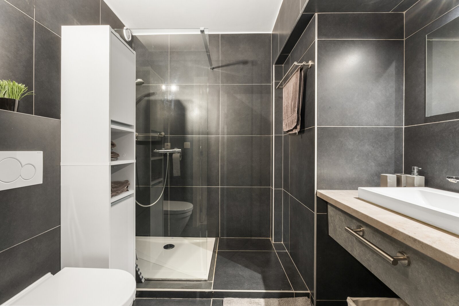 Grand hall d'entrée avec placards de rangement, salon spacieux et lumineux, cuisine entièrement équipée, 3 chambres spacieuses dont 1 avec salle d'eau attenante (douche et lavabo), 2 salles de bains avec douche à l'italienne, lavabo sur meuble, WC, terrasse ensoleillée où vous pourrez profiter du soleil jusque tard dans la soirée.