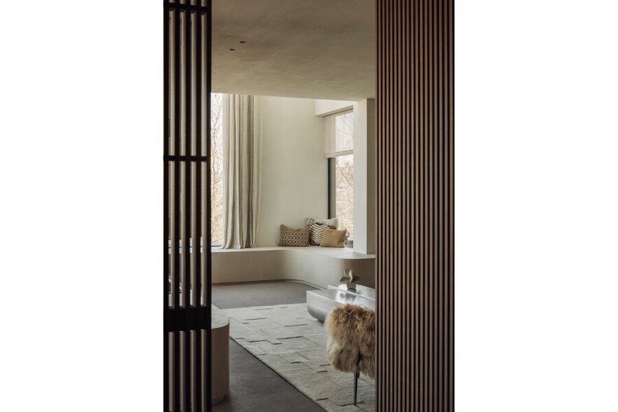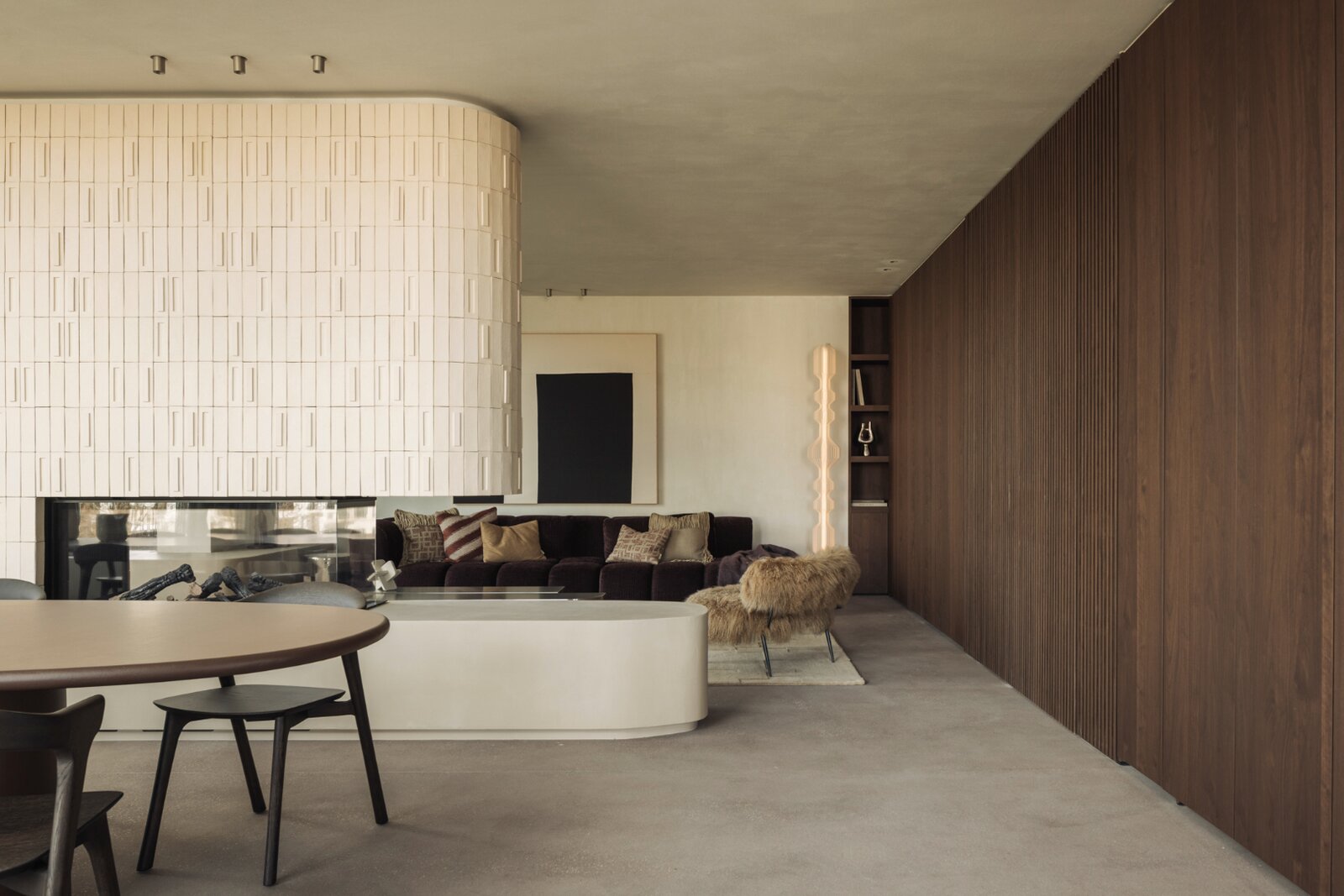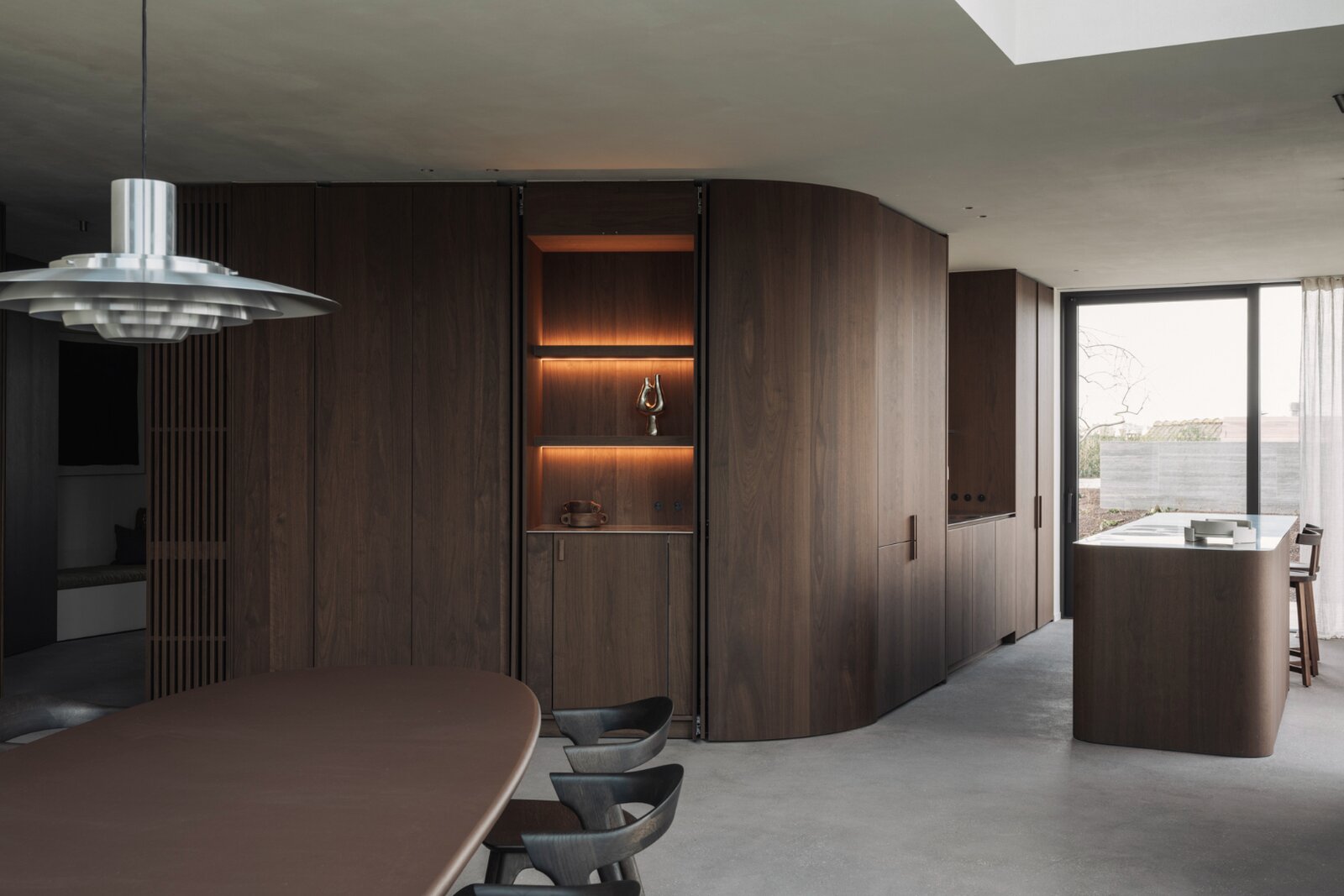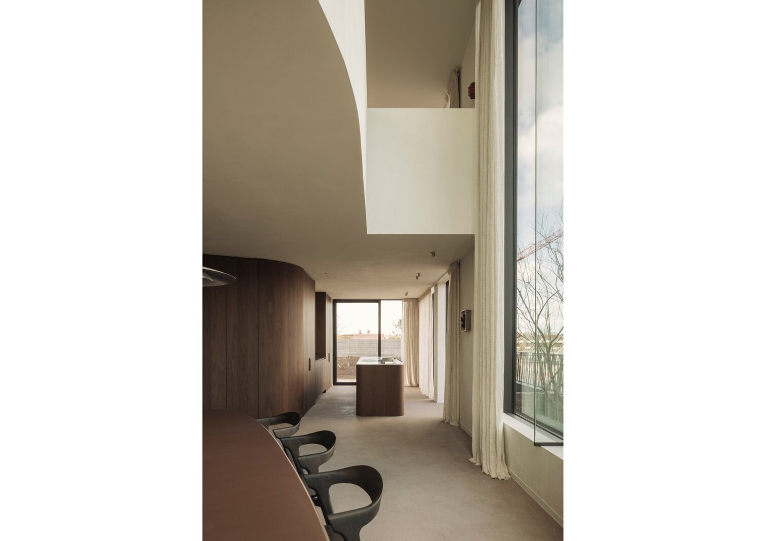L’ascenseur vous mène directement dans l’appartement, où une porte dissimulée ouvre sur une spectaculaire salle à manger et un vaste espace de vie. Dès l’entrée, la sensation d’espace est saisissante, sublimée par d’imposantes baies vitrées atteignant une hauteur de 5 à 6 mètres, offrant une luminosité exceptionnelle et une atmosphère ouverte et aérienne.
