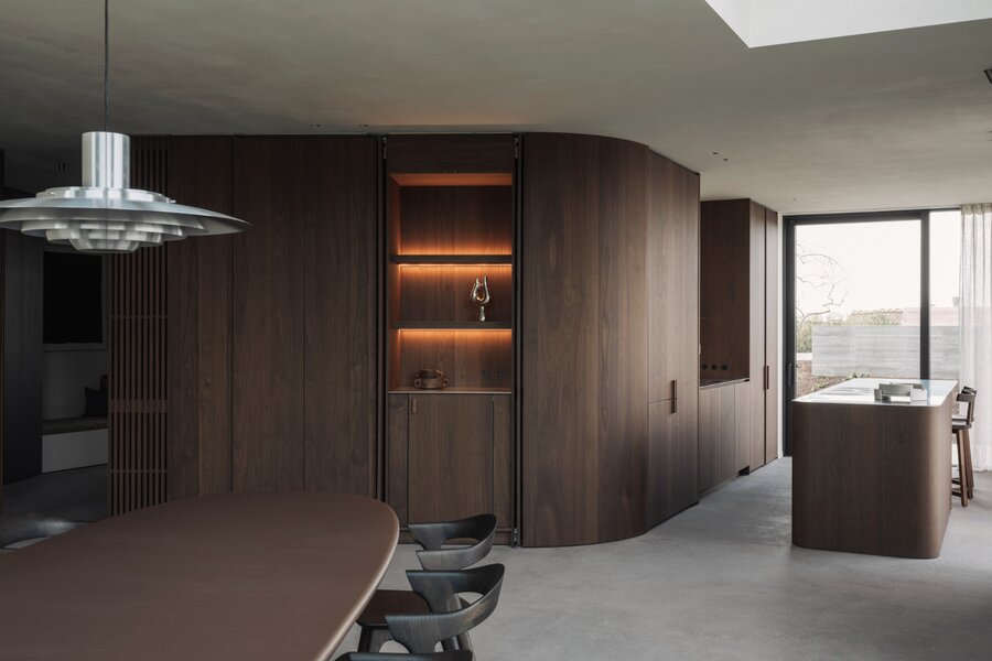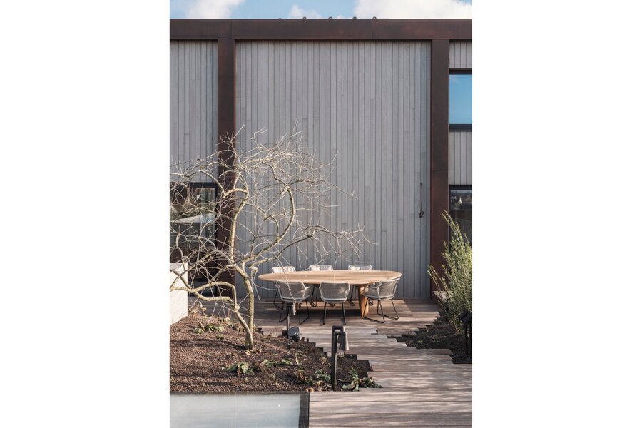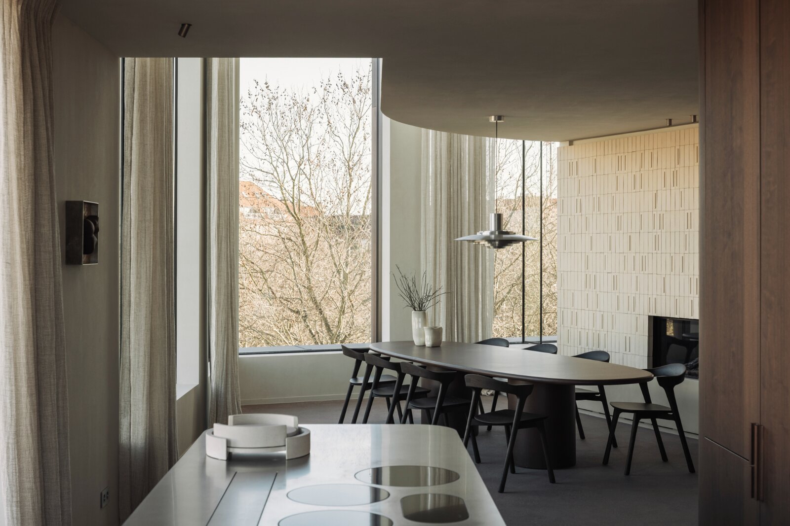 La somptueuse cuisine Obumex, parfaitement équipée avec des plaques de cuisson haut de gamme Novy, allie élégance et fonctionnalité et s’ouvre sur le magnifique jardin de toit aménagé. Dans son prolongement se trouvent la salle à manger et le séjour raffiné avec cheminée au gaz, habillés de carrelages sur mesure, où confort et sophistication se rencontrent harmonieusement.