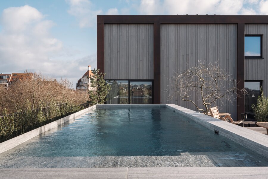 Le point culminant absolu de cette propriété réside dans son espace extérieur exceptionnel: un vaste jardin sur le toit avec une piscine privée chauffée de 11 mètres, unique à Knokke. Un lieu rare où vous profitez en toute tranquillité et intimité du soleil, de l’espace et de vues dégagées - un luxe exceptionnel à ce niveau.