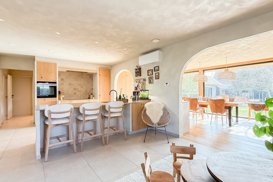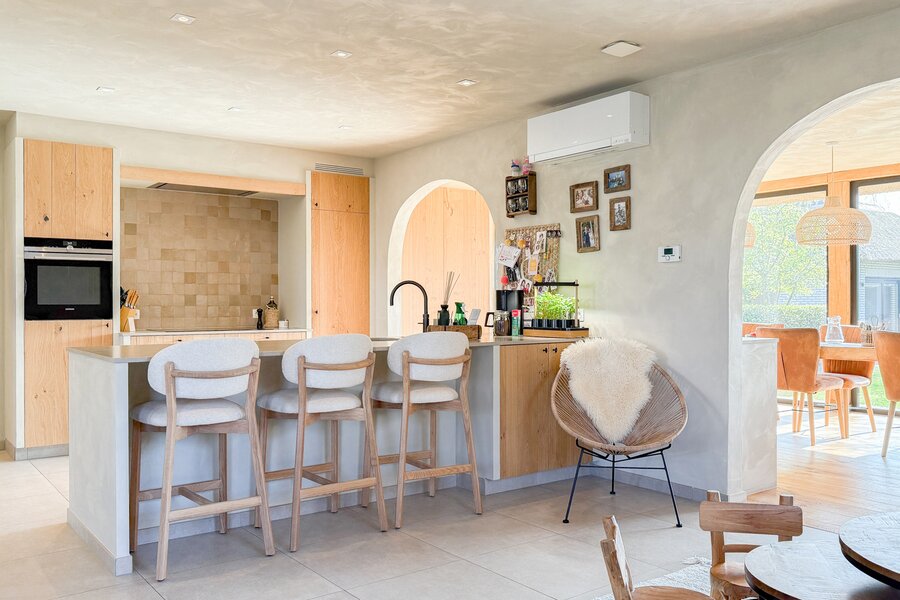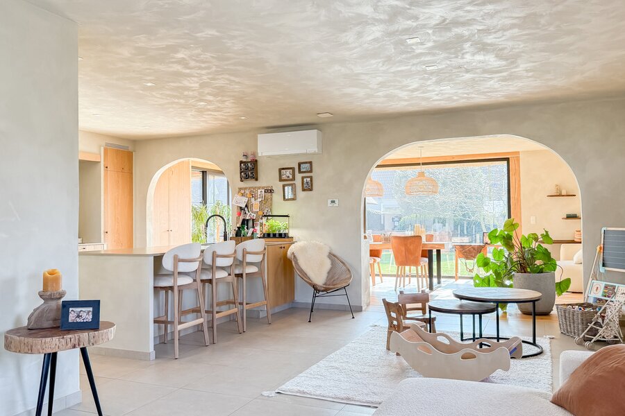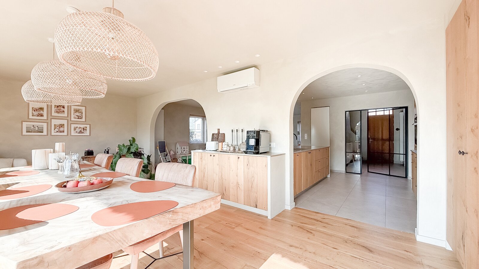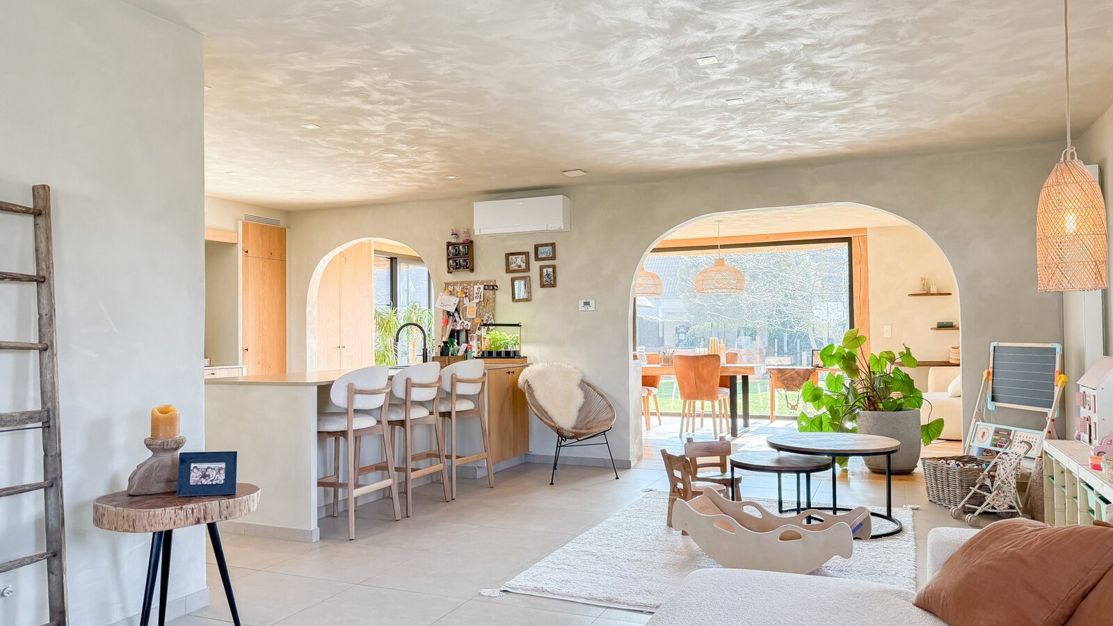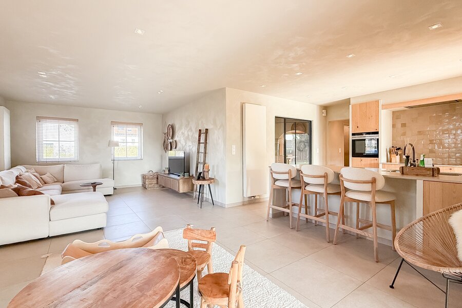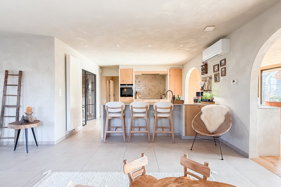 Le séjour a été aménagé avec beaucoup de soin et s’ouvre harmonieusement sur la cuisine ouverte, véritable cœur de la maison. Cette cuisine entièrement équipée, avec un coin petit-déjeuner convivial, invite à partager des moments en famille et constitue le centre de la vie quotidienne. L’aménagement ouvert et le choix de matériaux chaleureux confèrent une atmosphère moderne tout en restant accueillante.
