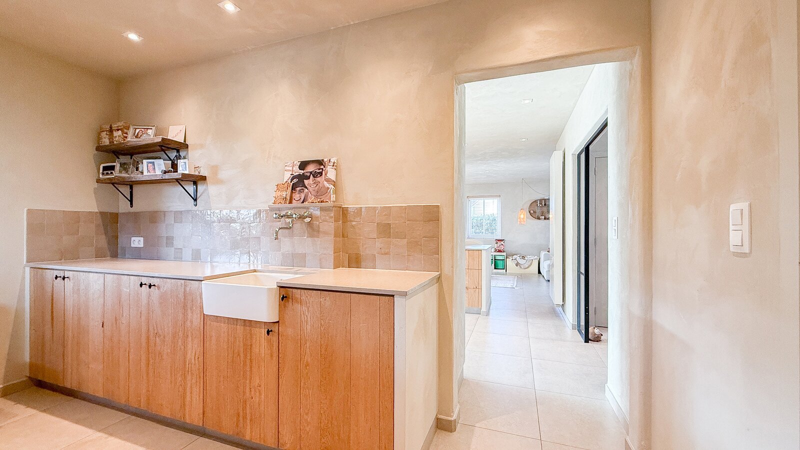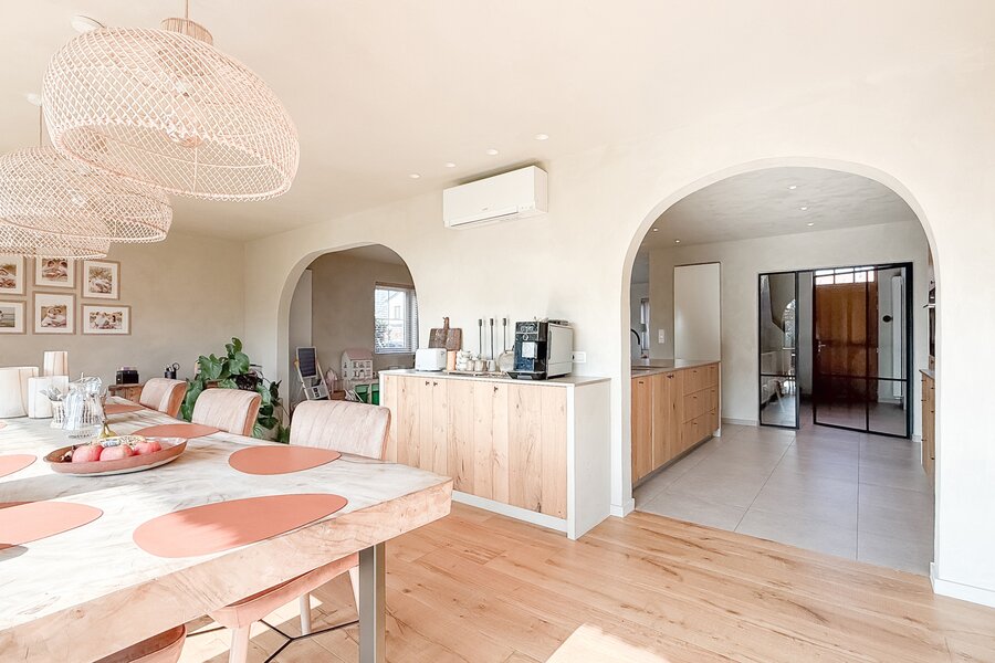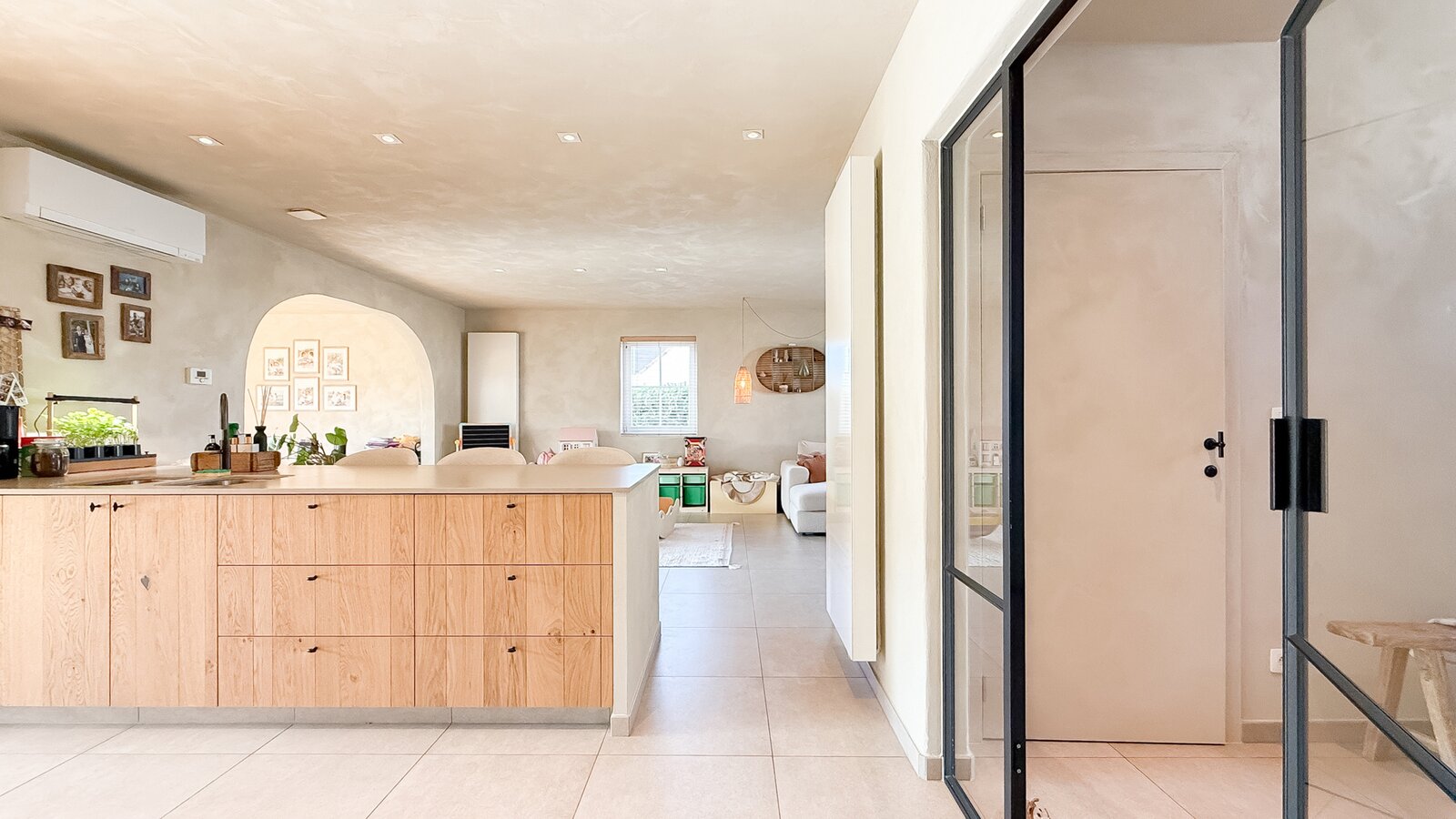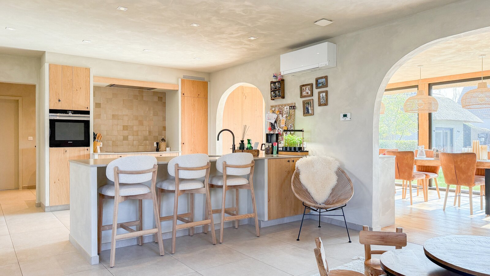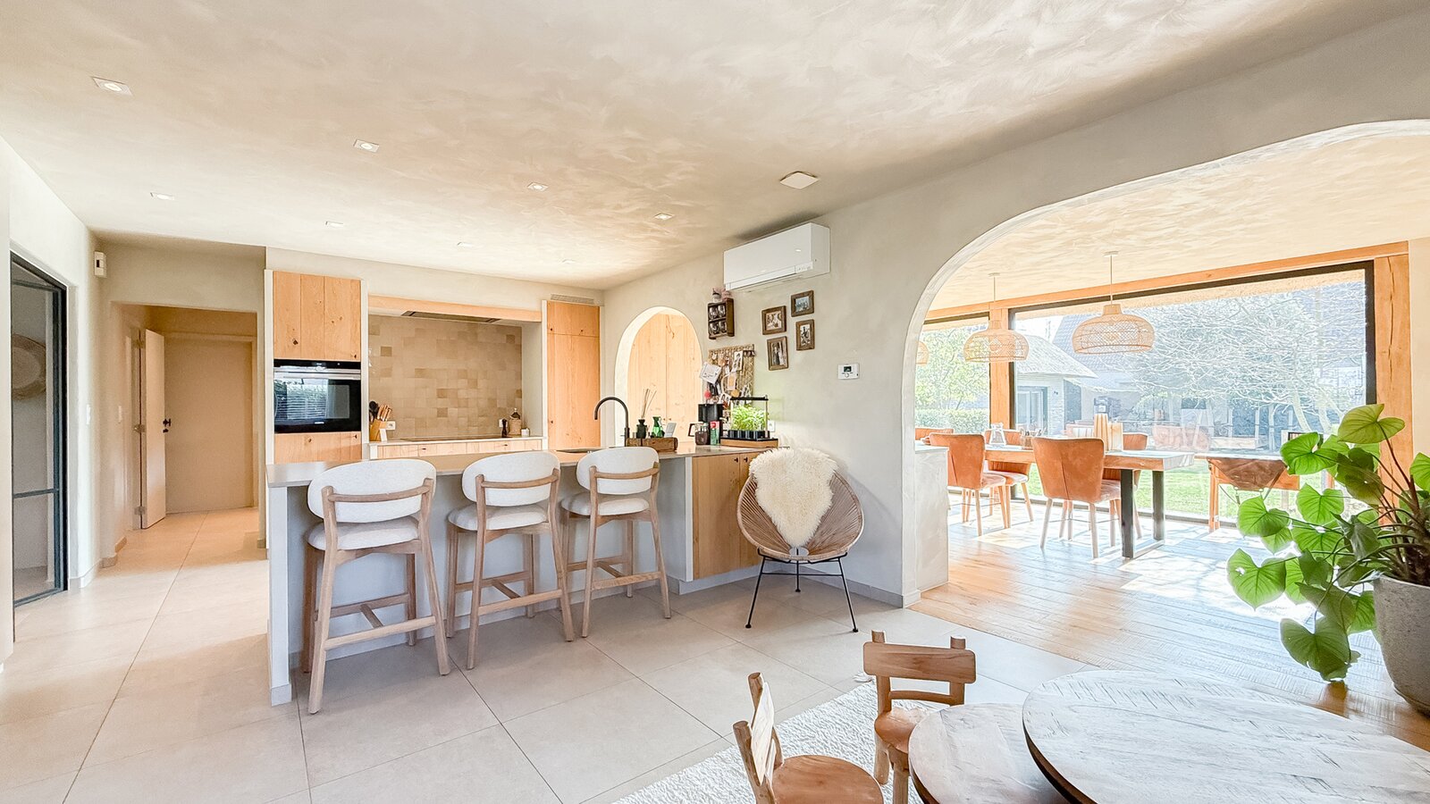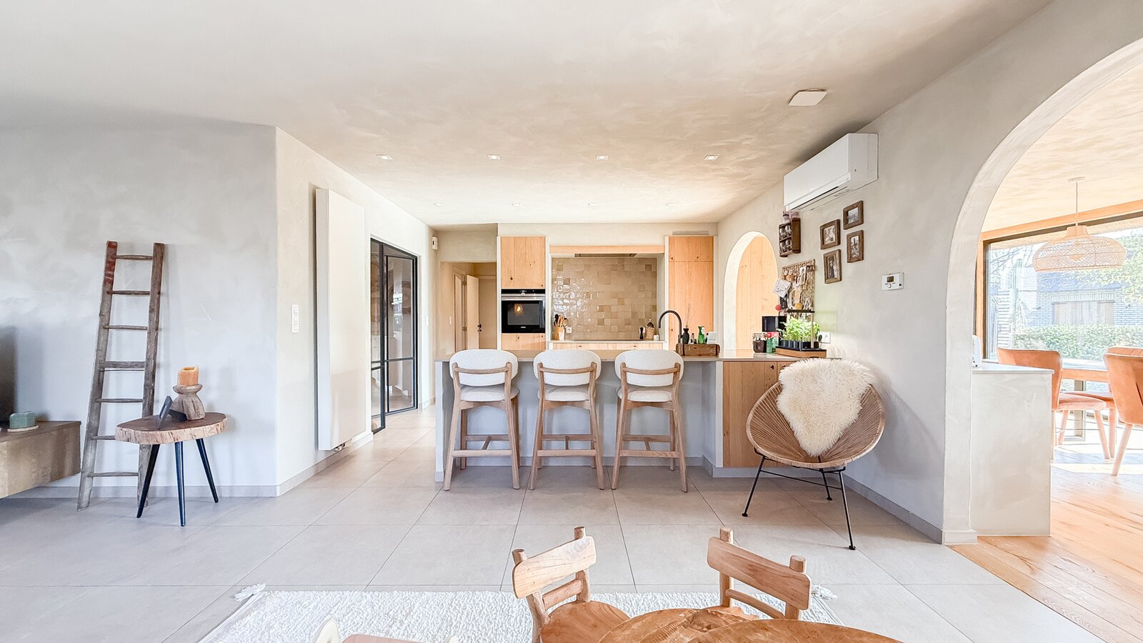 Le séjour a été aménagé avec beaucoup de soin et s’ouvre harmonieusement sur la cuisine ouverte, véritable cœur de la maison. Cette cuisine entièrement équipée, avec un coin petit-déjeuner convivial, invite à partager des moments en famille et constitue le centre de la vie quotidienne. L’aménagement ouvert et le choix de matériaux chaleureux confèrent une atmosphère moderne tout en restant accueillante.