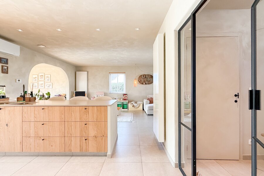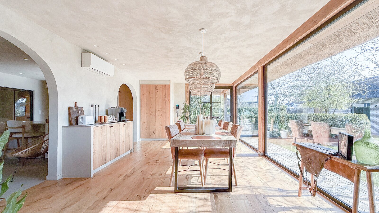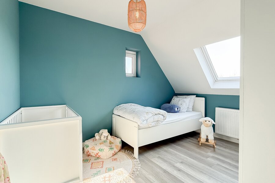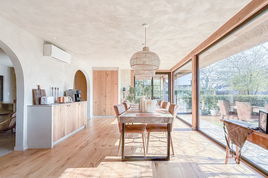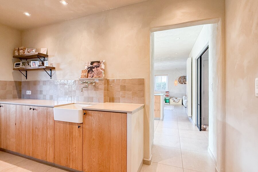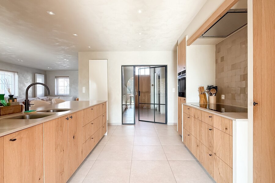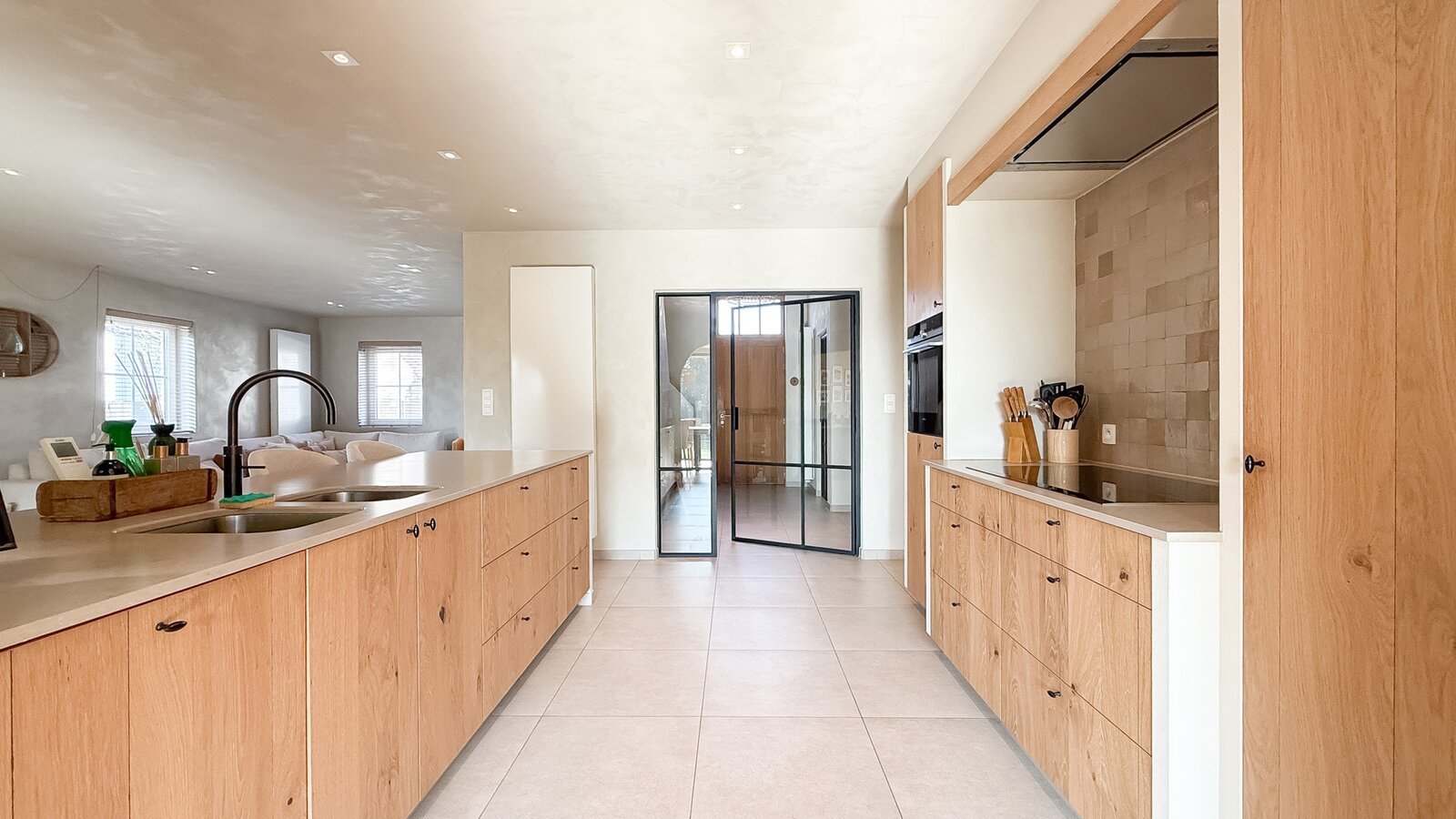 Le séjour a été aménagé avec beaucoup de soin et s’ouvre harmonieusement sur la cuisine ouverte, véritable cœur de la maison. Cette cuisine entièrement équipée, avec un coin petit-déjeuner convivial, invite à partager des moments en famille et constitue le centre de la vie quotidienne. L’aménagement ouvert et le choix de matériaux chaleureux confèrent une atmosphère moderne tout en restant accueillante.