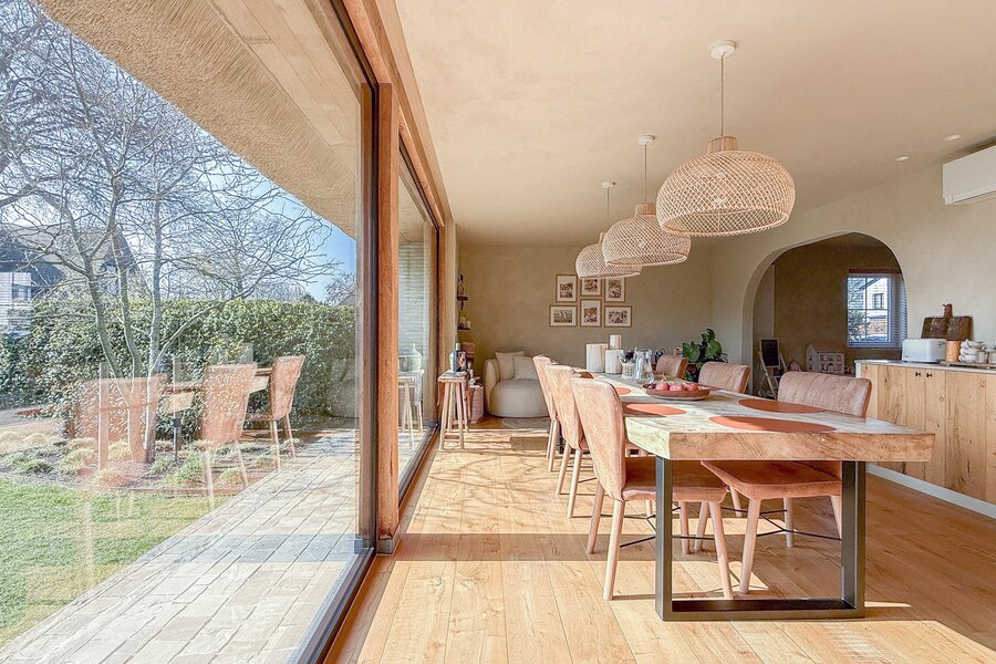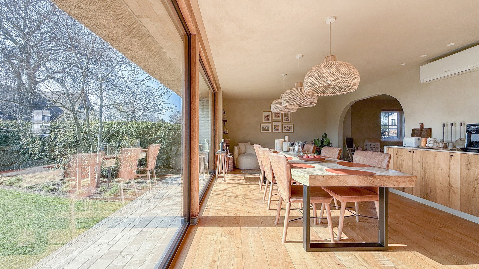 La salle à manger, avec ses grandes baies vitrées, offre un joli contact avec le jardin et renforce la sensation de vie intérieure-extérieure. Depuis le séjour, l’accès direct à la terrasse, partiellement couverte, permet de profiter de l’extérieur tout au long de l’année.