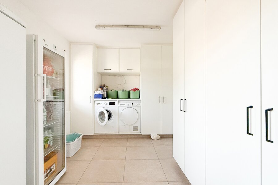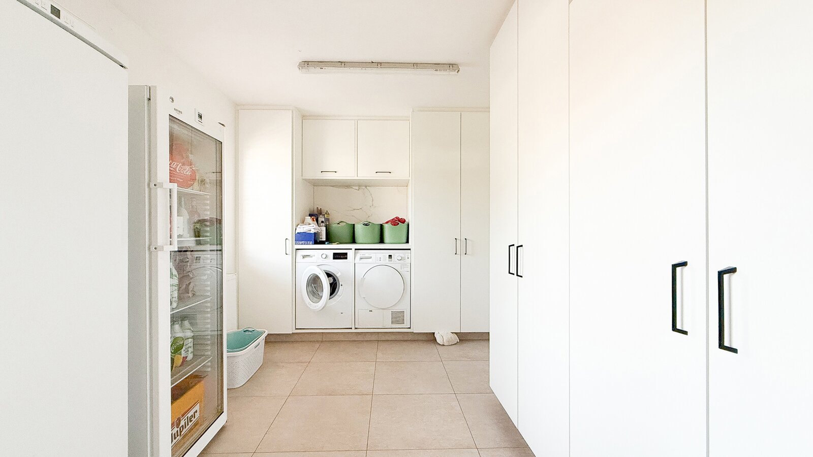 La maison dispose également d’une buanderie pratique avec espace douche supplémentaire et d’un garage intégré, équipé notamment d’un réfrigérateur supplémentaire, d’une machine à laver et d’un sèche-linge.
