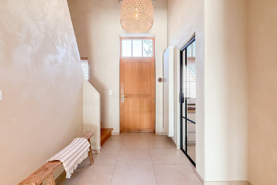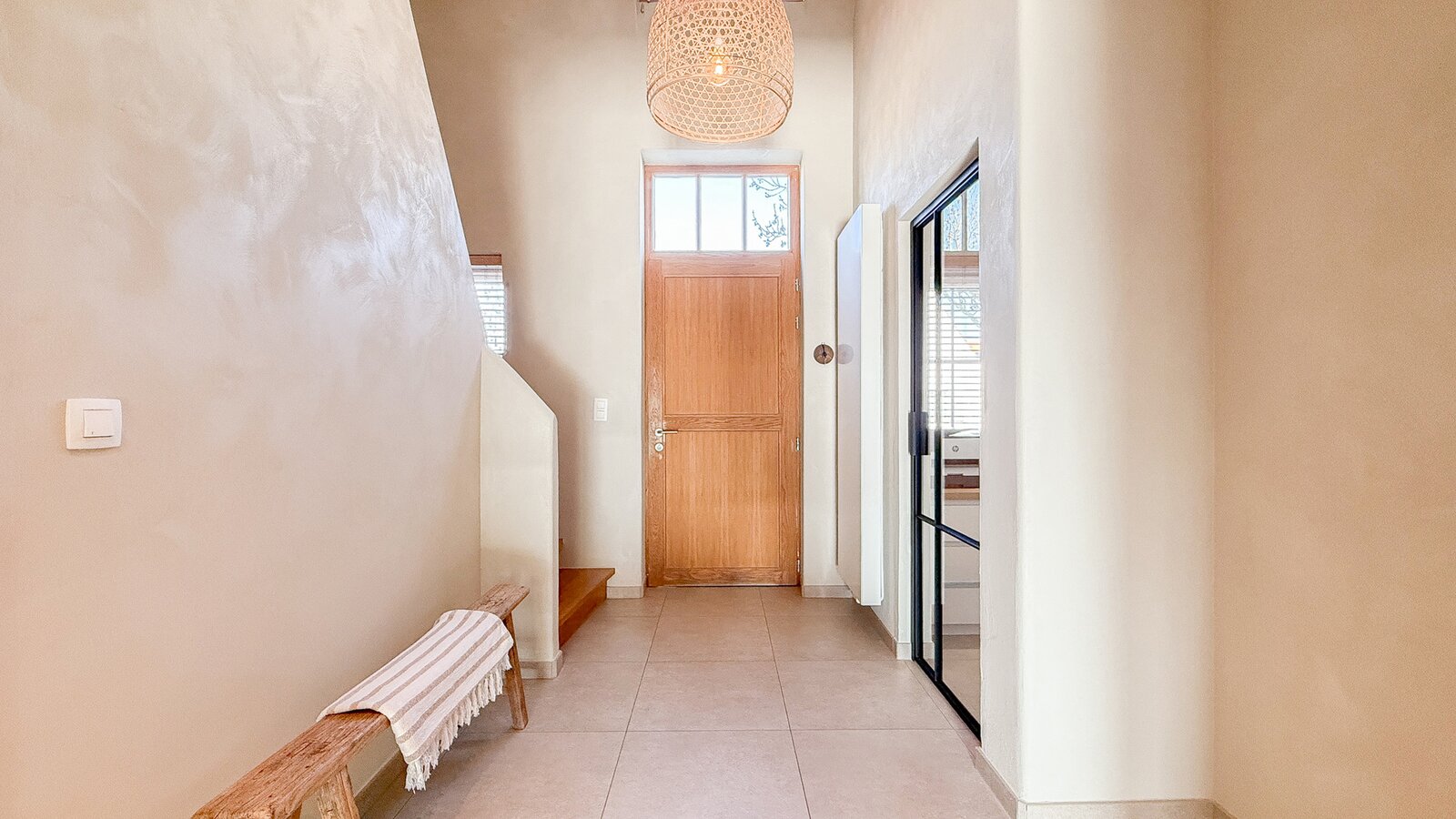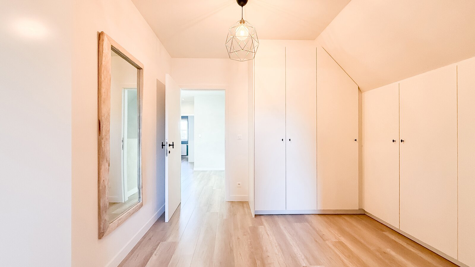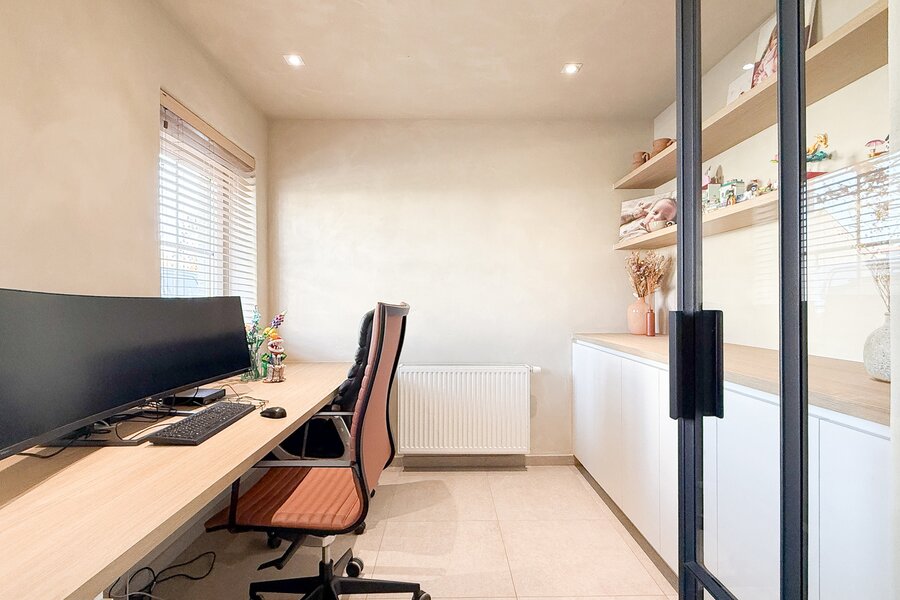 Le hall d’entrée spacieux, avec ses hauts plafonds et ses toilettes invités, crée immédiatement une impression d’espace et de lumière. Il dessert également un agréable bureau, idéal pour le télétravail.