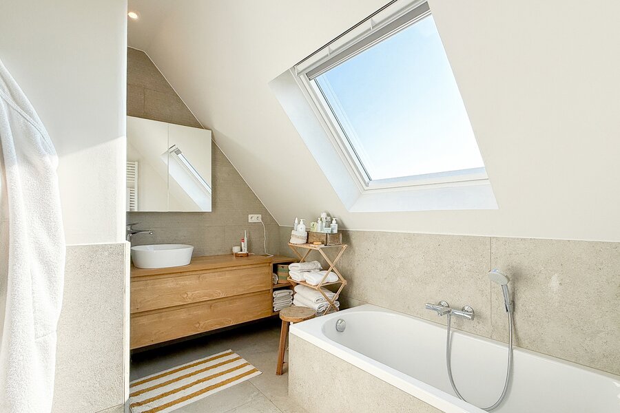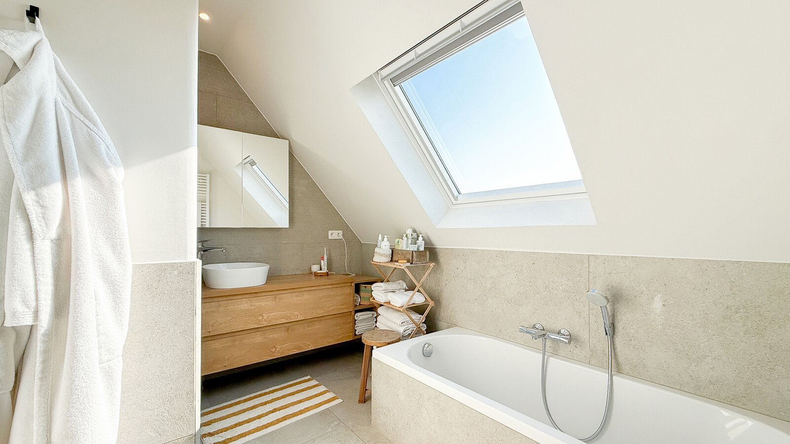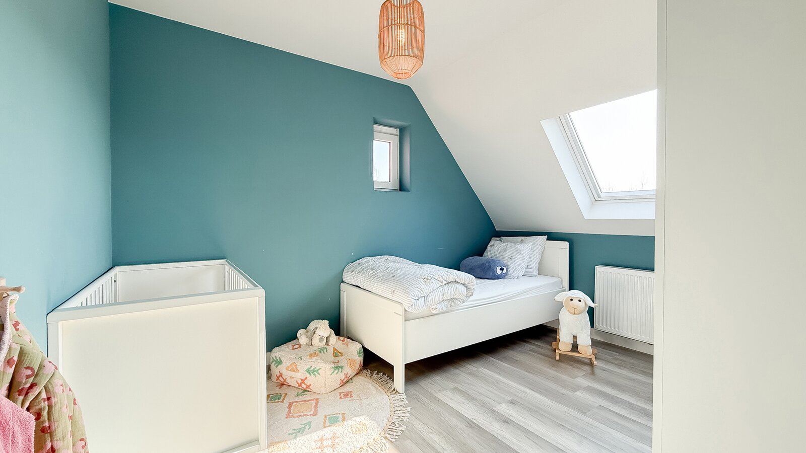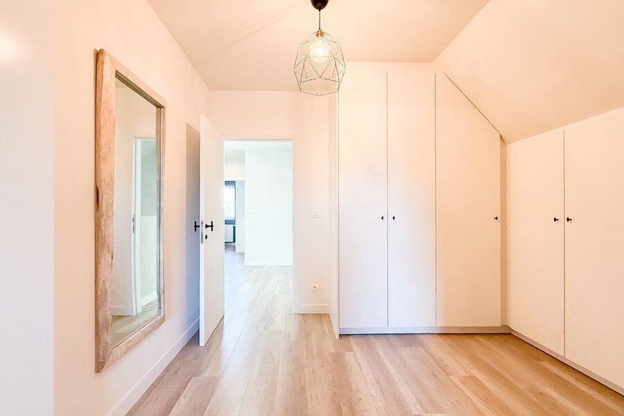 À l’étage se trouve la chambre principale avec dressing attenant. La salle de bains séparée est équipée d’une baignoire, d’une douche à l’italienne et d’un lavabo. Deux autres chambres complètent ce niveau.
