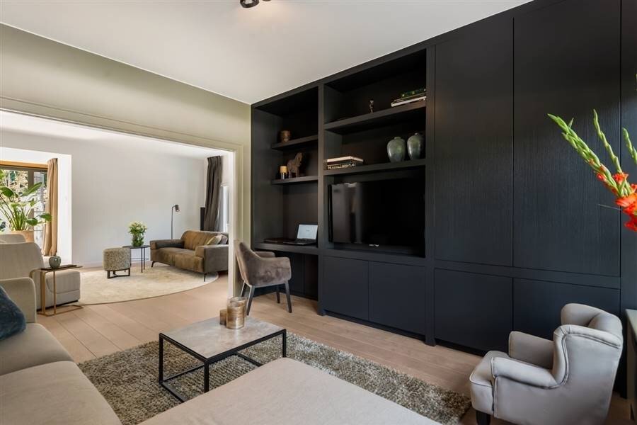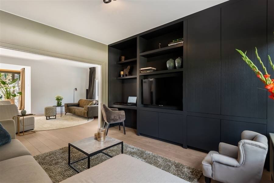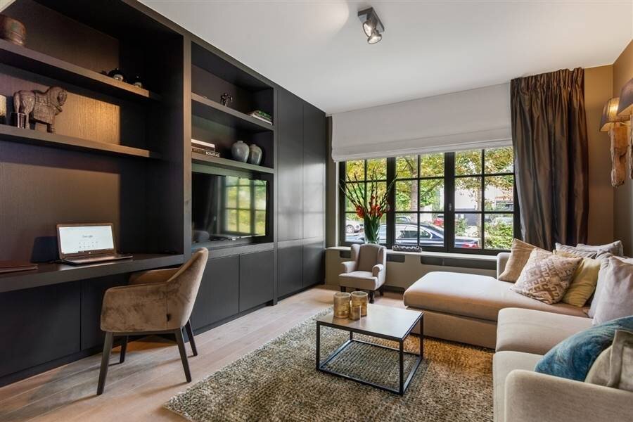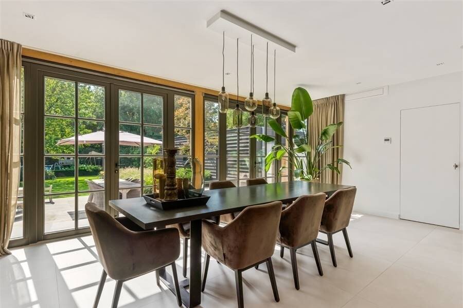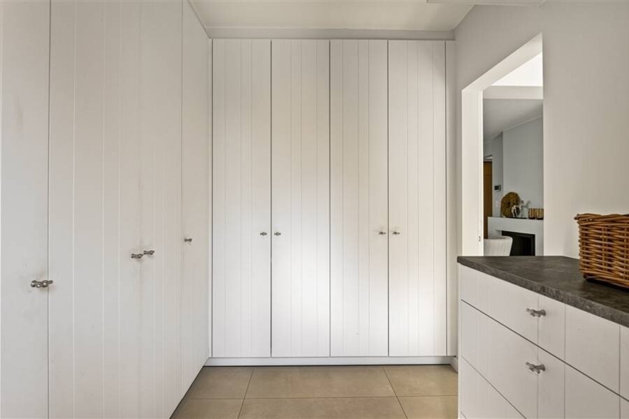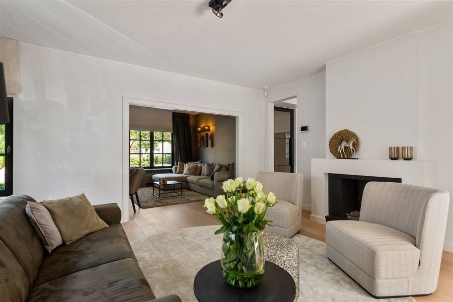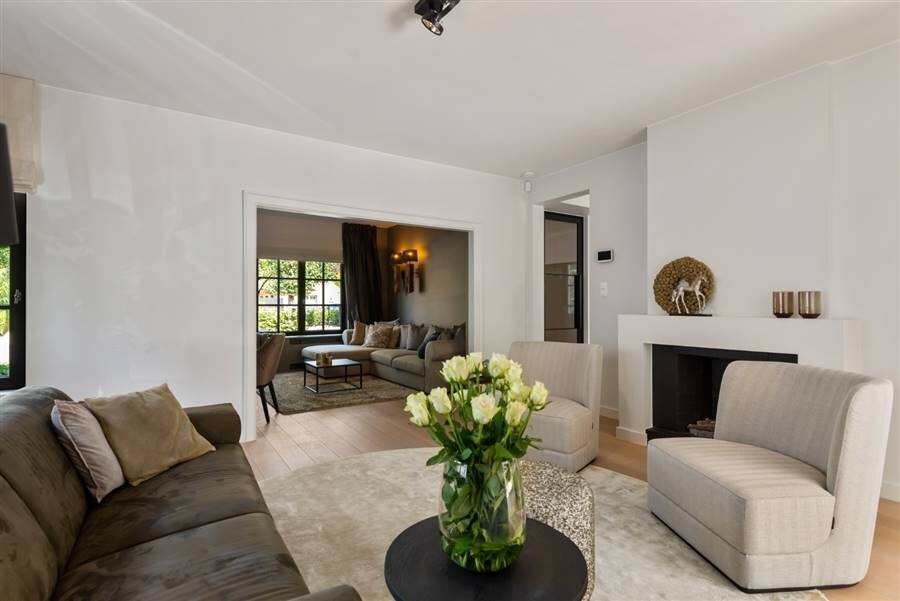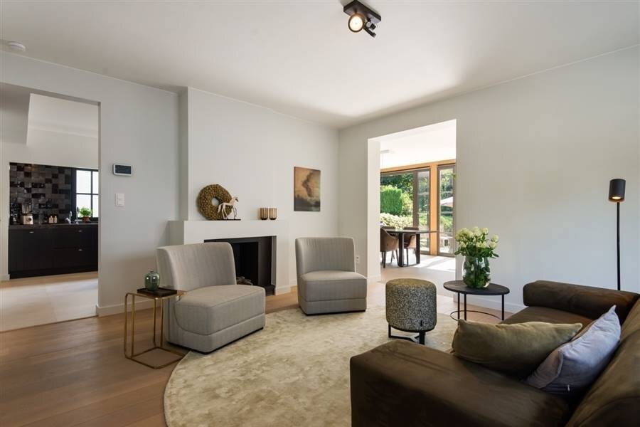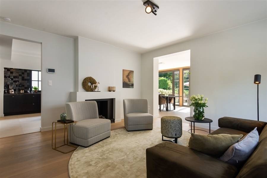 Vous entrez dans le hall d'entrée avec les toilettes pour invités et les escaliers menant au premier étage. Du hall, on accède à la cuisine, suivie de la spacieuse salle à manger / orangerie avec vue sur le jardin et accès à la terrasse. Le salon est divisé en une salle de télévision à l'avant et un salon central attenant à la salle à manger, tous deux sur parquet en chêne. Le salon est également équipé d'une cheminée à gaz et communique ouvertement avec la salle à manger/cuisine. Grâce à deux doubles portes de jardin, la façade arrière peut s'ouvrir presque entièrement sur la terrasse. La cuisine est équipée de divers appareils encastrés, la salle à manger est dotée d'une cheminée au gaz, d'un chauffage par le sol et de l'air conditionné. Depuis la cuisine, on accède également à l'entrée arrière avec vestibule.