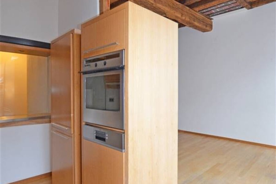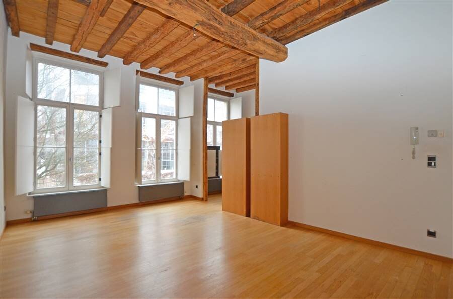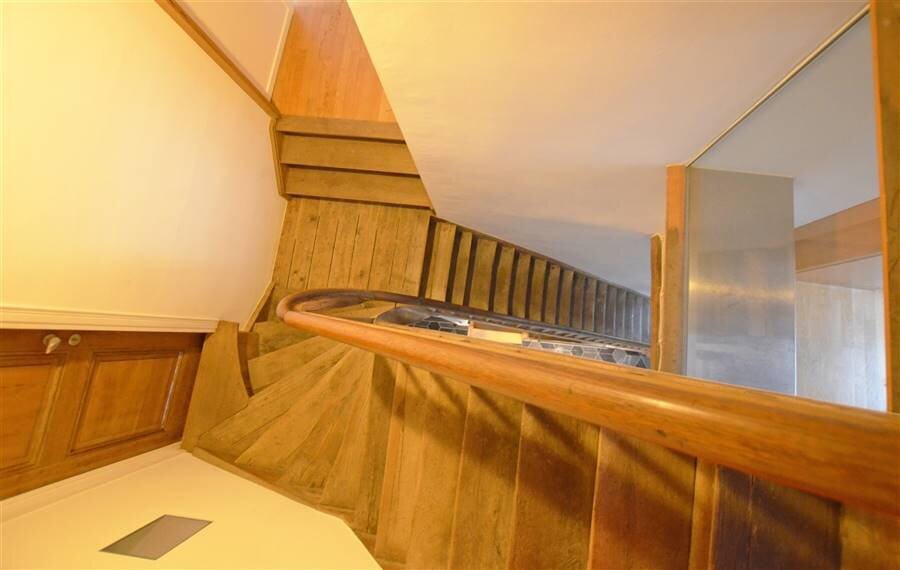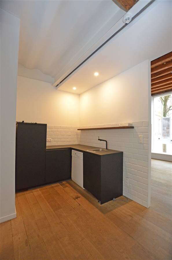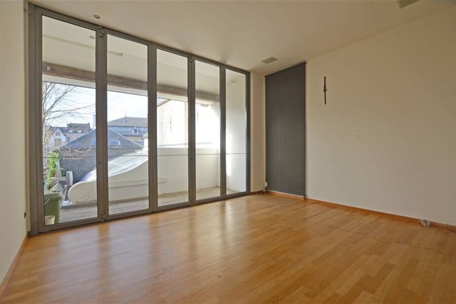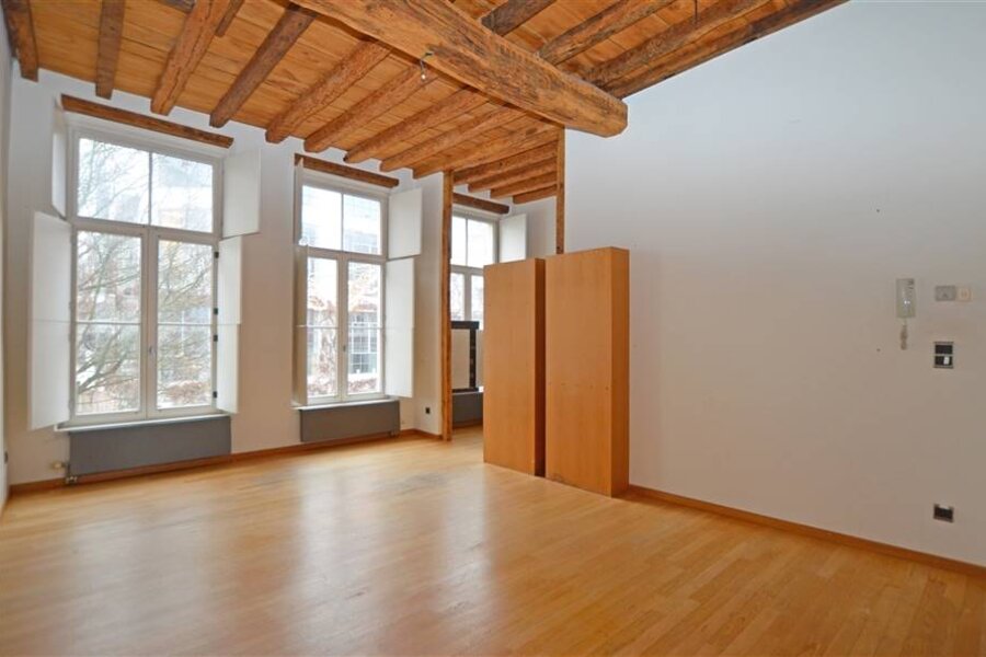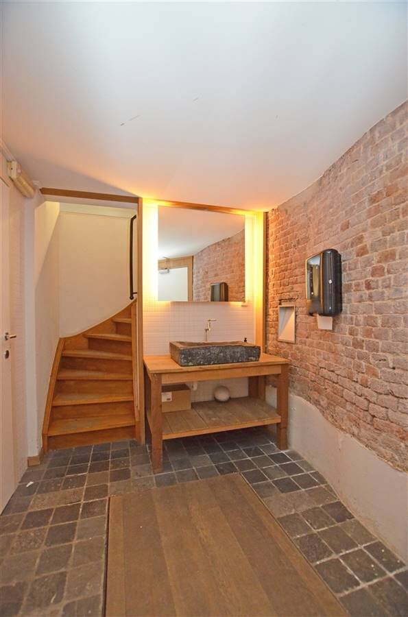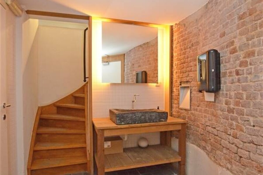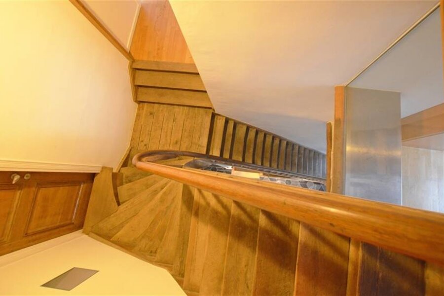 Via een karaktervolle trap is de eerste verdieping bereikbaar. Hier bevindt zich de lichtrijke leefruimte met aansluitend een volledig uitgeruste keuken en eetplaats. Het aangename terras biedt hier een rustige buitenruimte midden in de stad.
