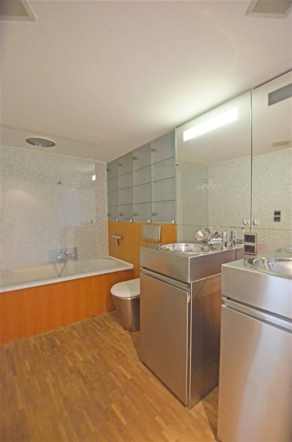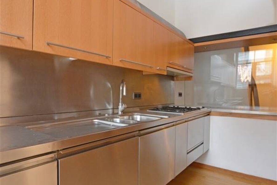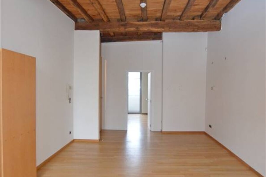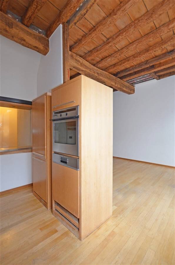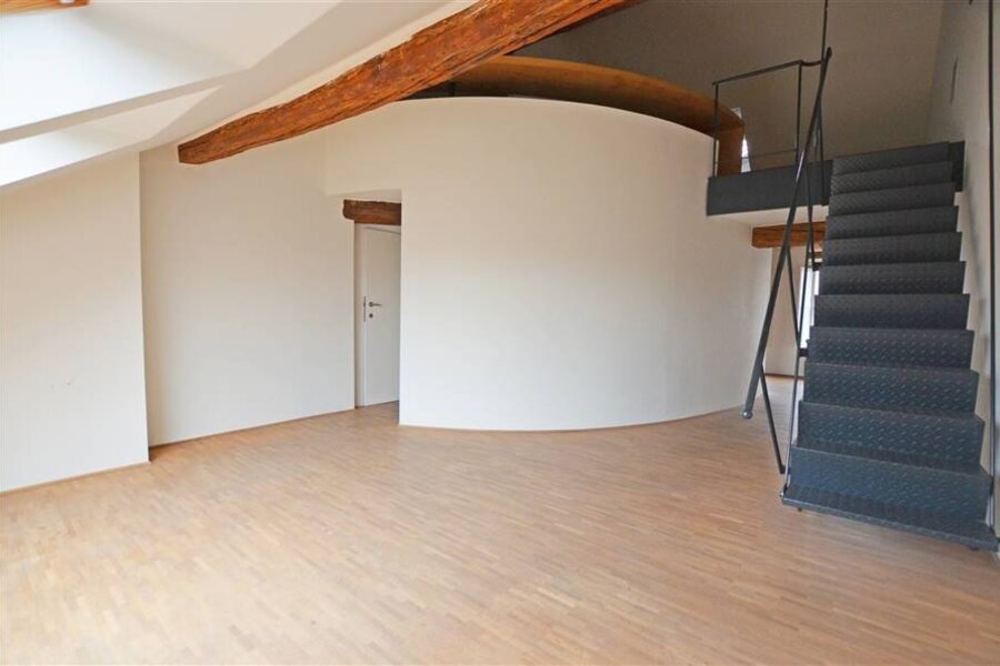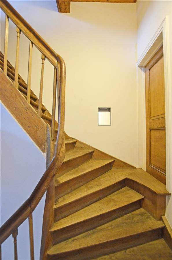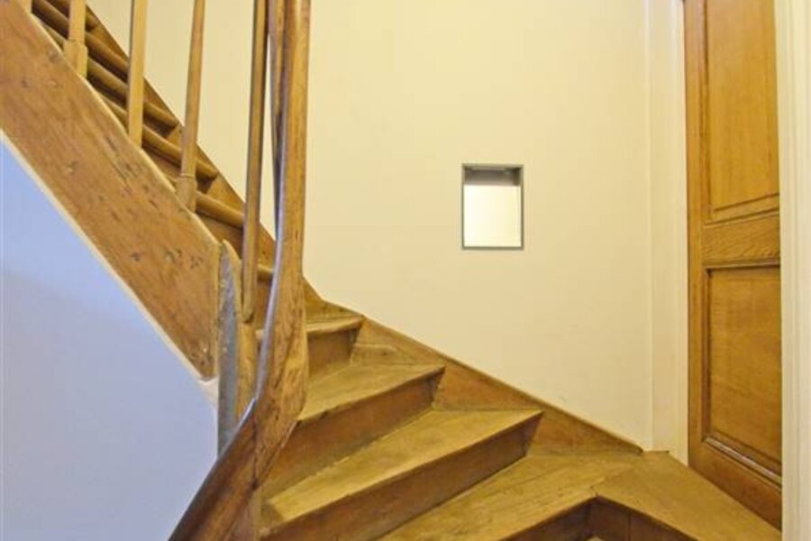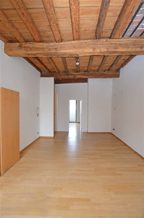 Via een karaktervolle trap is de eerste verdieping bereikbaar. Hier bevindt zich de lichtrijke leefruimte met aansluitend een volledig uitgeruste keuken en eetplaats. Het aangename terras biedt hier een rustige buitenruimte midden in de stad.