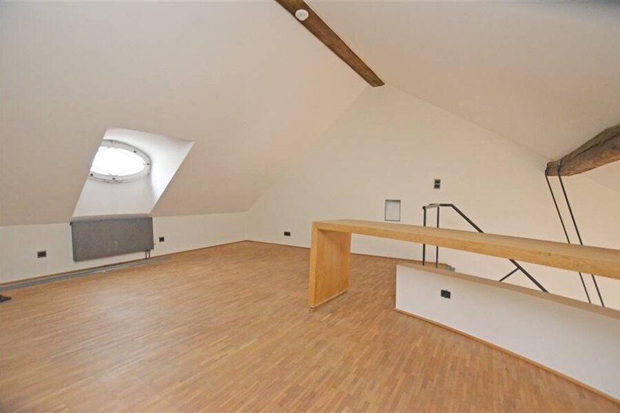 De tweede verdieping omvat een sfeervolle slaapkamer met dressing, een apart toilet en een badkamer. De verrassende mezzanine, open tot in de nok, geeft de woning een bijzondere ruimtelijkheid en kan perfect dienen als bureau of hobbyruimte.