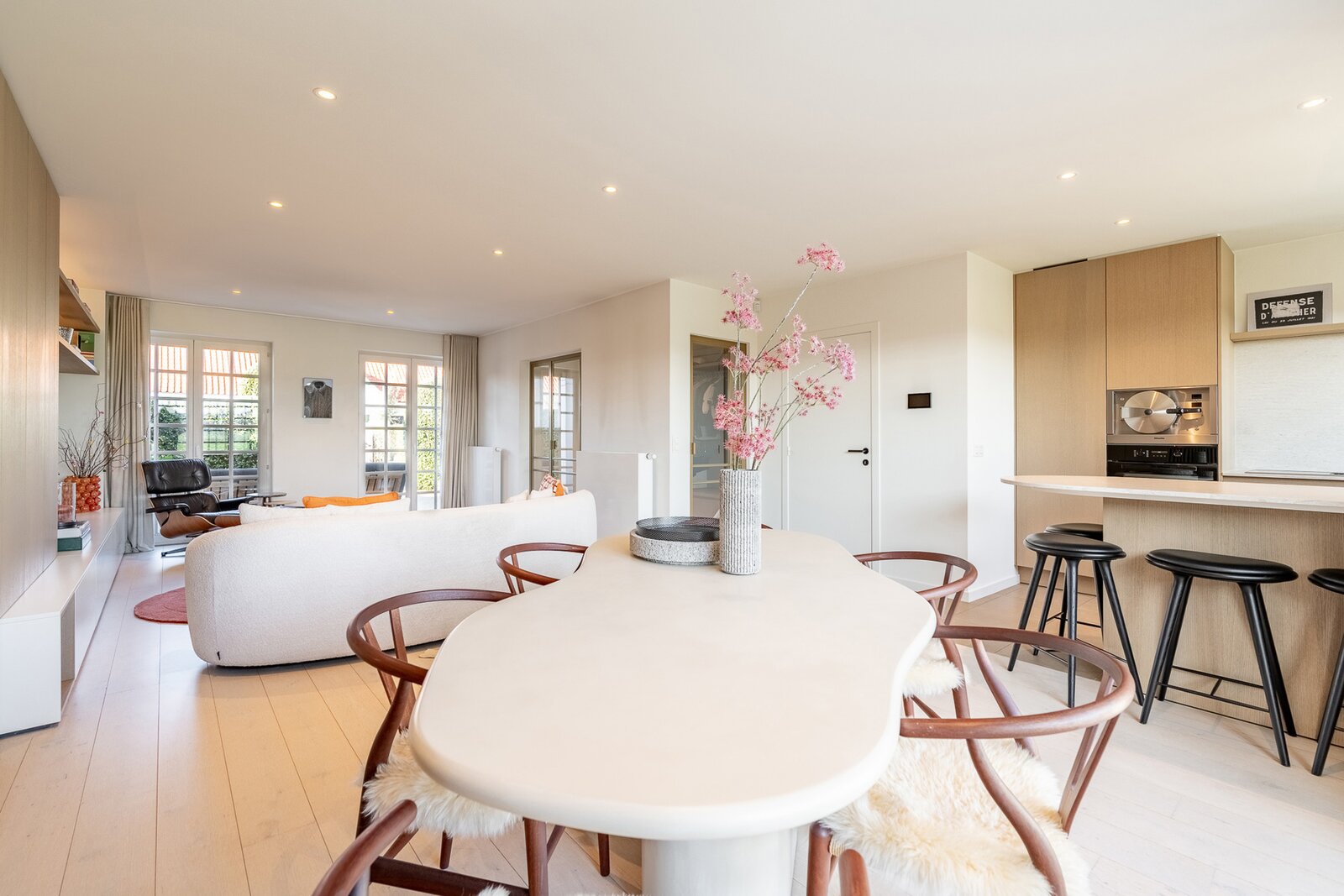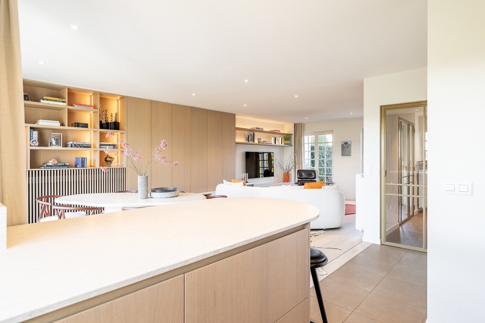 Hall d’entrée avec toilette invités et vestiaire. Cuisine ouverte entièrement équipée, en lien direct avec la salle à manger, donnant accès à la terrasse et au jardin, où vous profitez de superbes vues dégagées. Dans le prolongement, un lumineux séjour avec accès à une seconde terrasse à l’avant de la maison.