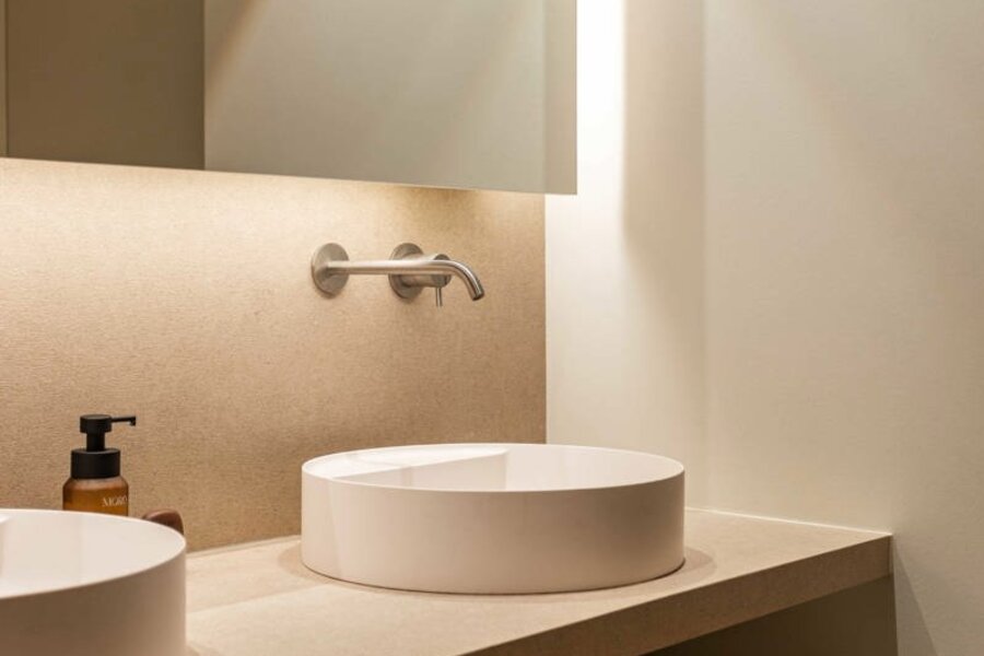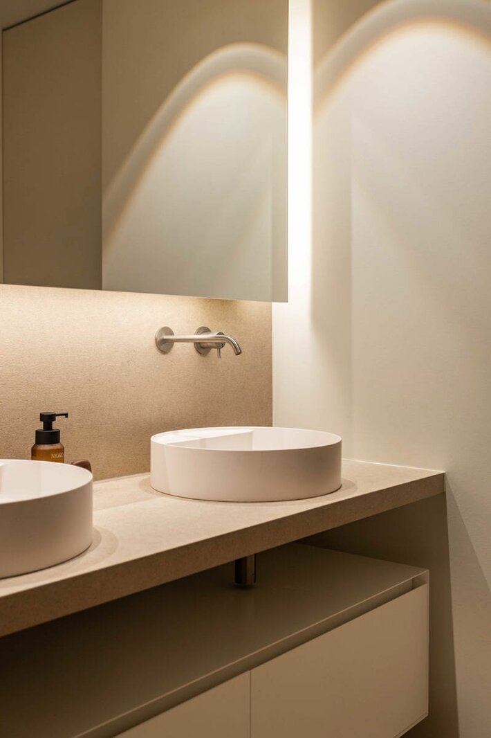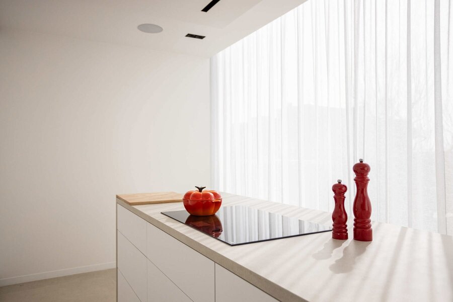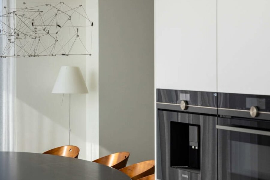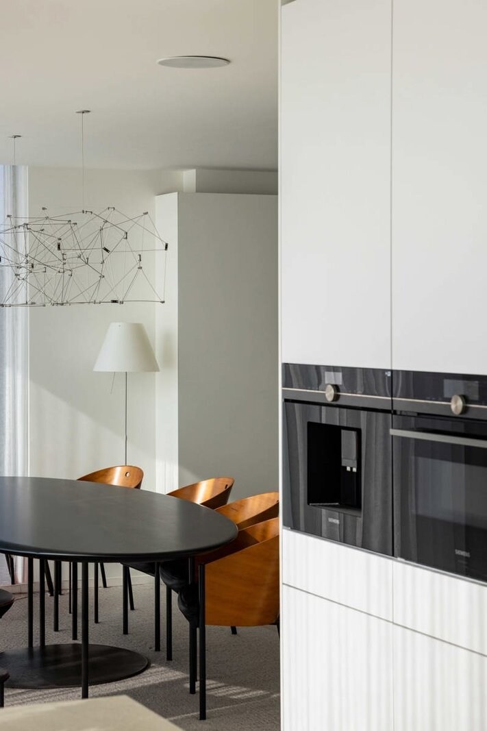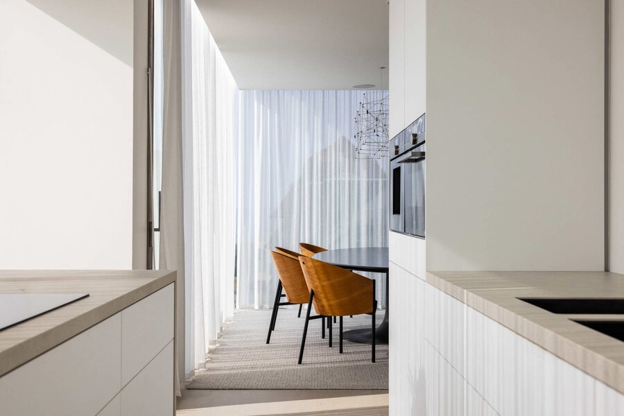 L'ascenseur vous conduit directement au penthouse, où des finitions luxueuses et minimalistes, réalisées dans des matériaux haut de gamme, donnent immédiatement le ton. L'espace de vie, la salle à manger et la cuisine baignent dans la lumière naturelle et s'enchaînent harmonieusement. Ils sont tous entourés de grandes terrasses, créant ainsi une transition harmonieuse entre l'intérieur et l'extérieur.