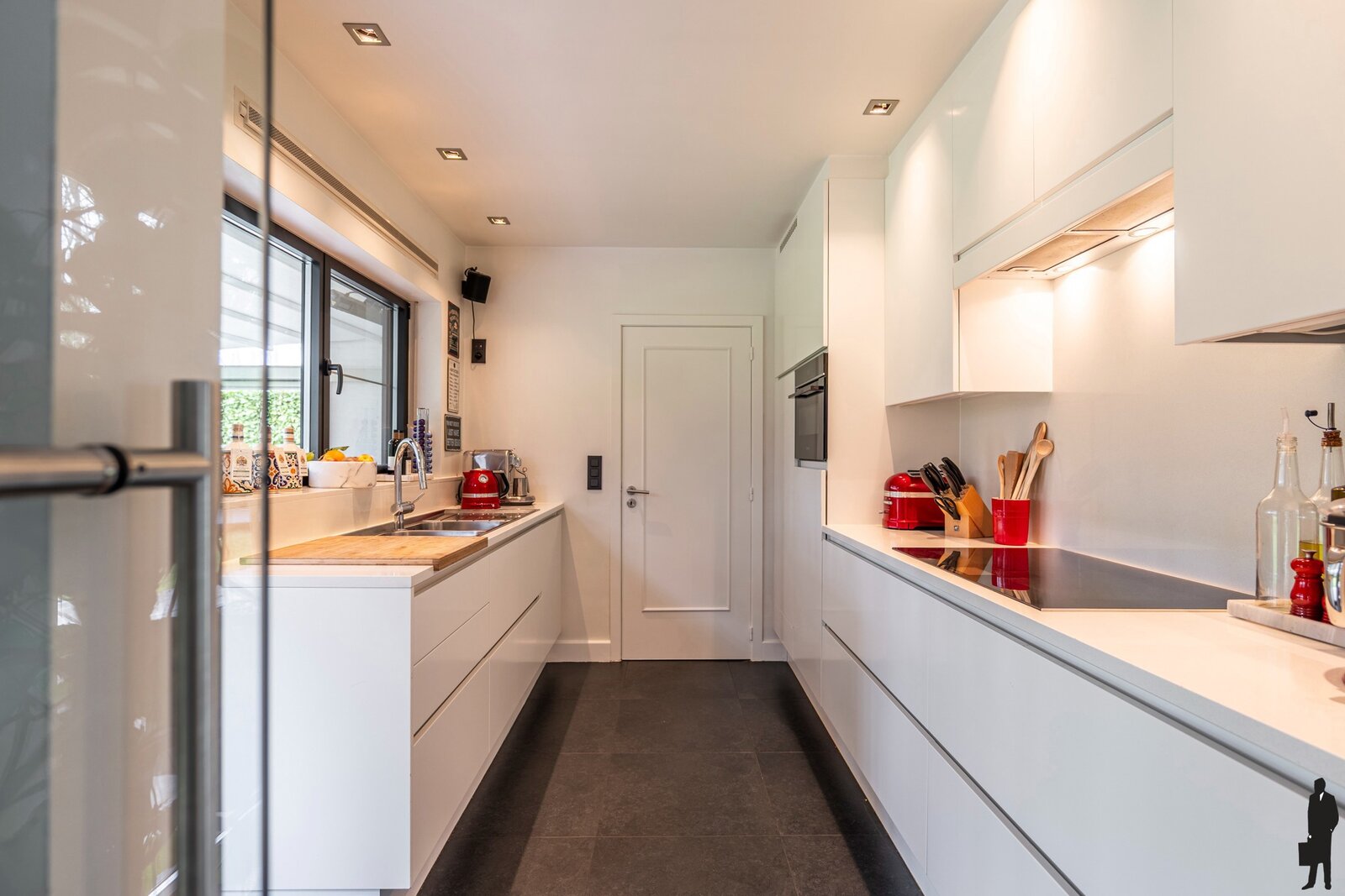 - een volledig uitgeruste keuken met dubbele lavabo, Siemens inductiekookplaat, Siemens oven, vaatwasser en ingebouwde koelkast, en deur naar deels overdekt terras en tuin,