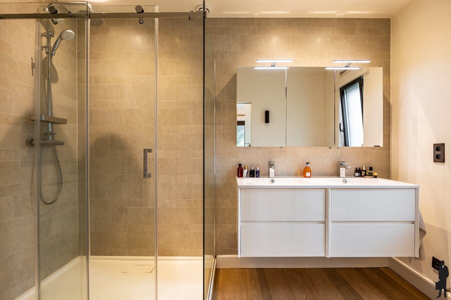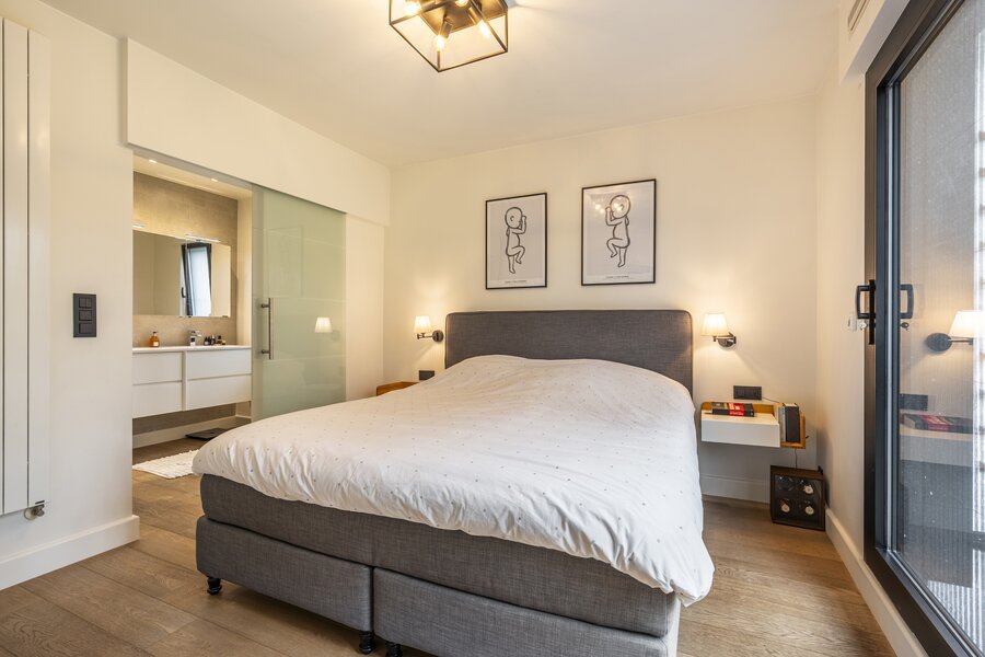 - een hoofdslaapkamer op parket met ingemaakte TV-kastenwand, schuifraam naar het terras en een ensuite badkamer met dubbele lavabo, toilet en douche,