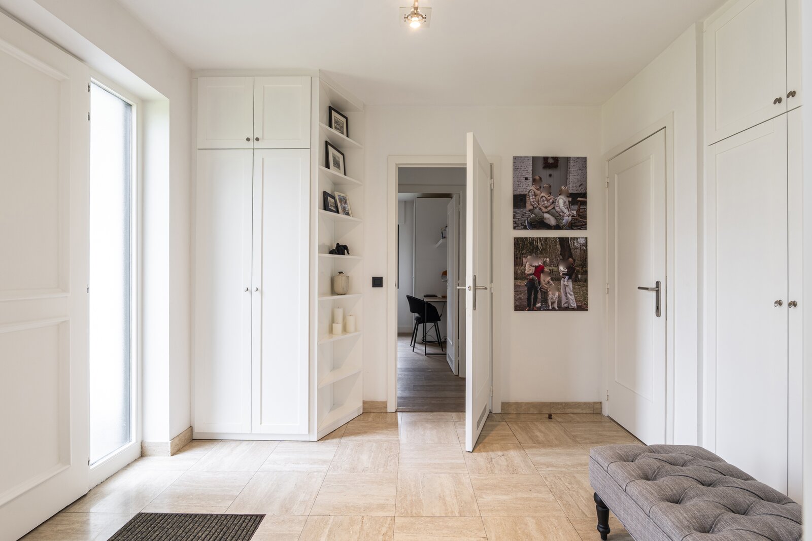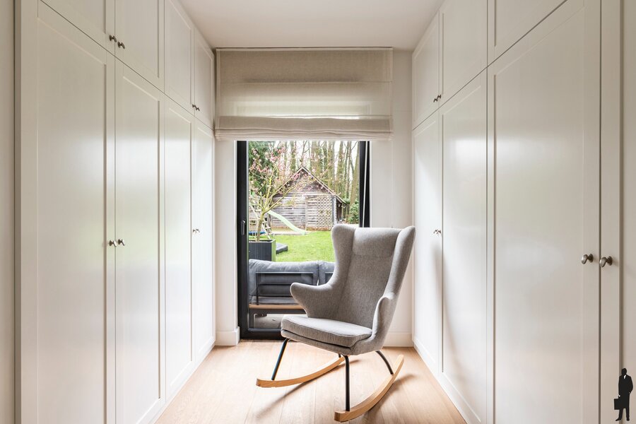 - een aparte dressing met ingemaakte kasten en zicht op de tuin,