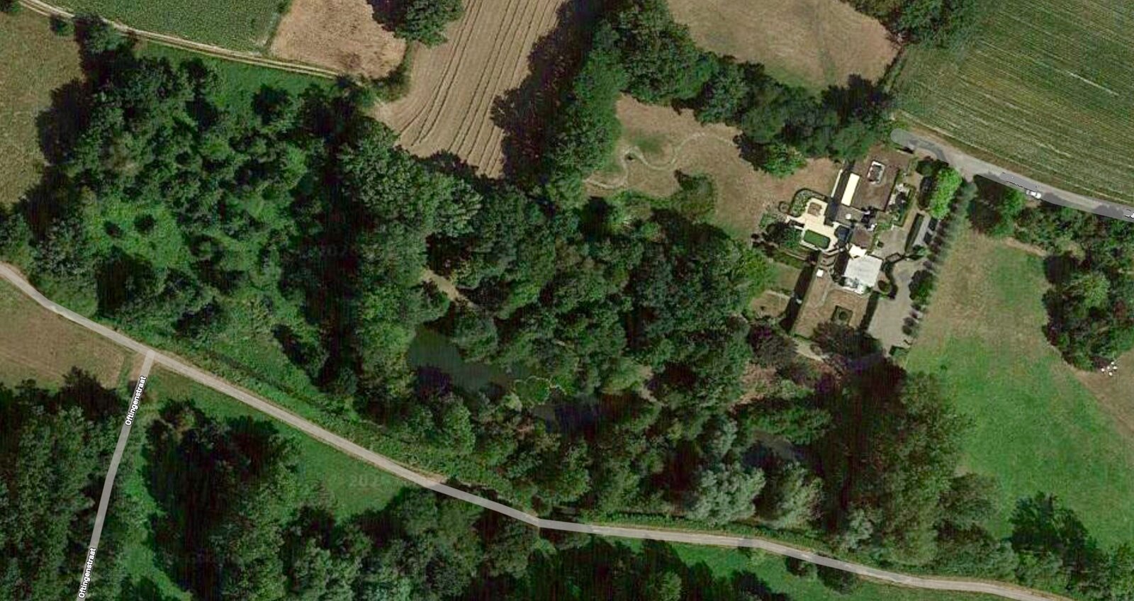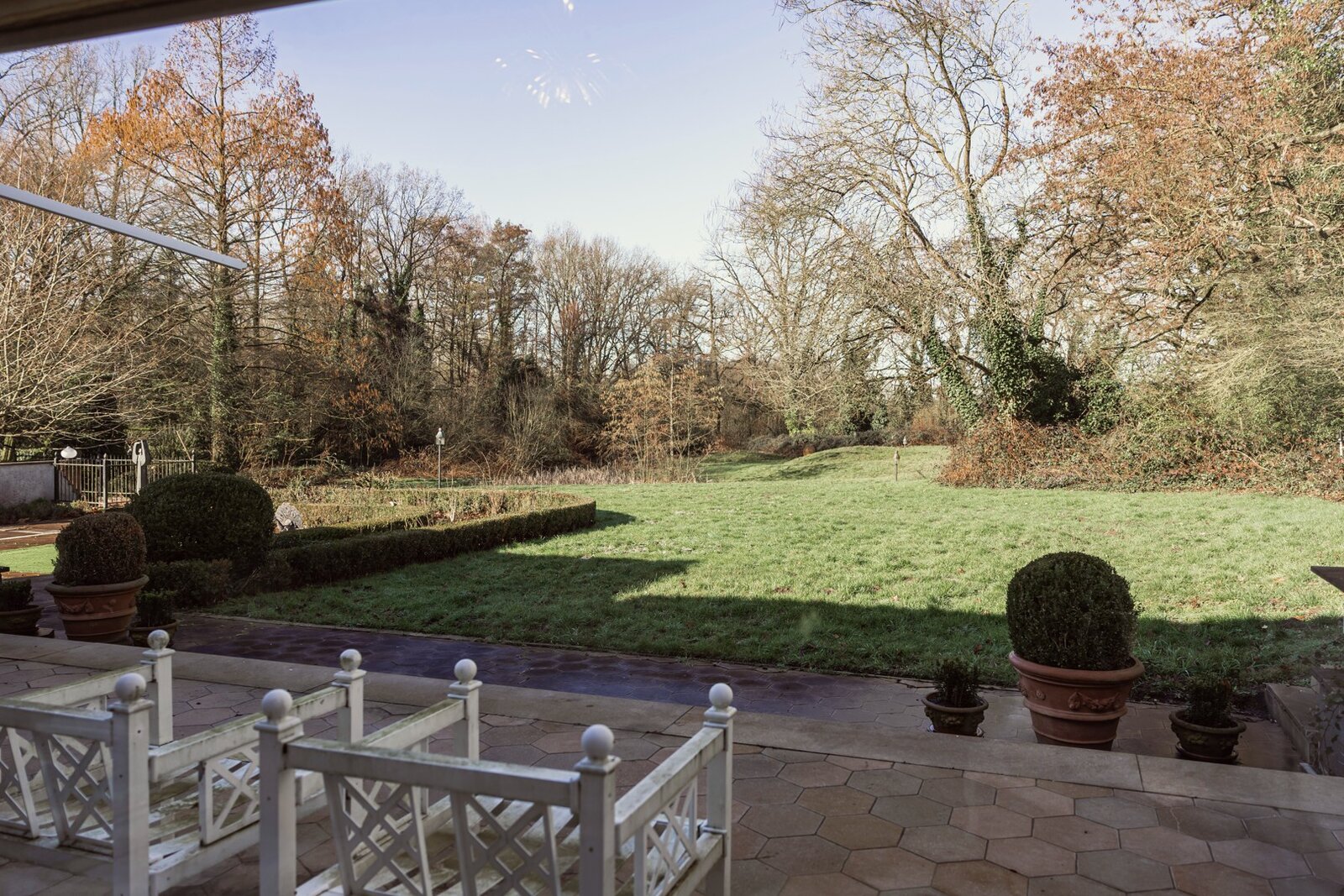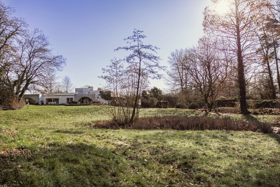 De tuin is uniek, letterlijk met de voeten tegen de Mombeek, prachtige bomen, vijvers en ruime terrassen met zwembad.