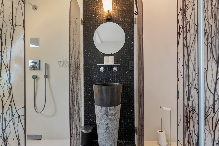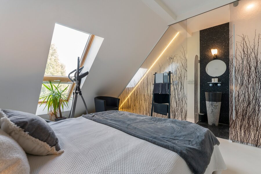 Le troisième étage offre une grande chambre principale avec salle de bains attenante, comprenant un élément en verre fait main unique qui attire l'attention. Il y a également une pièce supplémentaire actuellement aménagée en bureau, avec la possibilité d'installer une salle de bains.