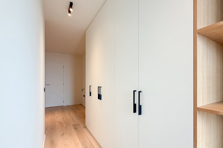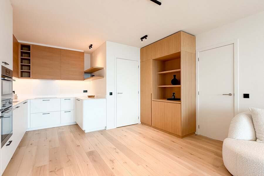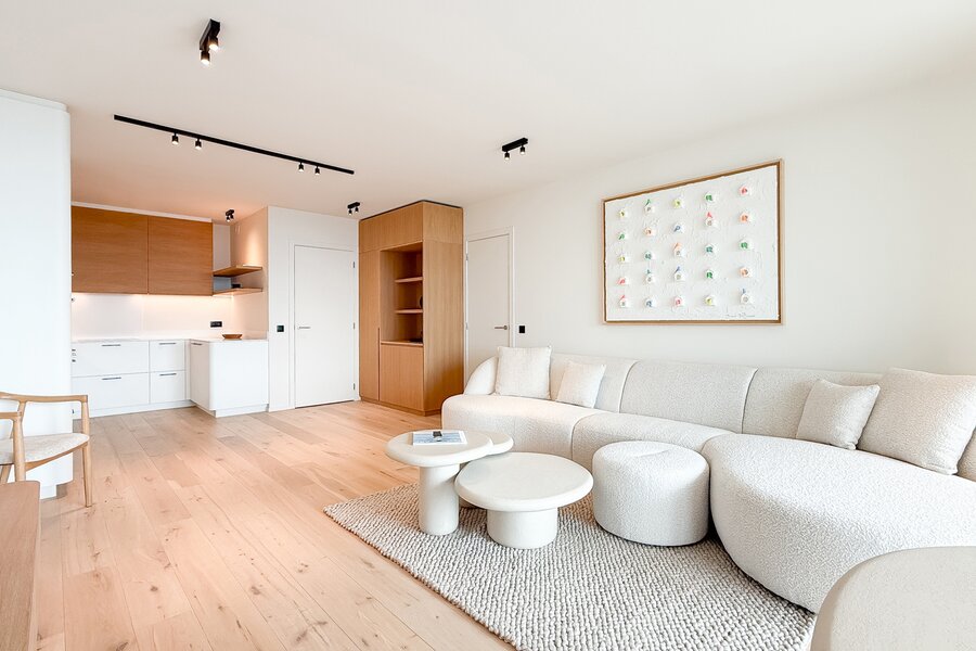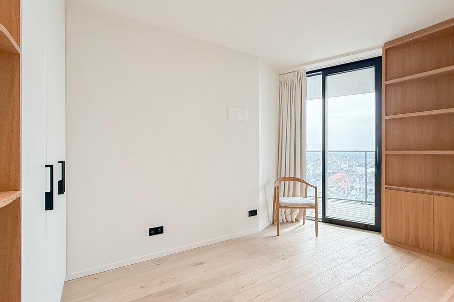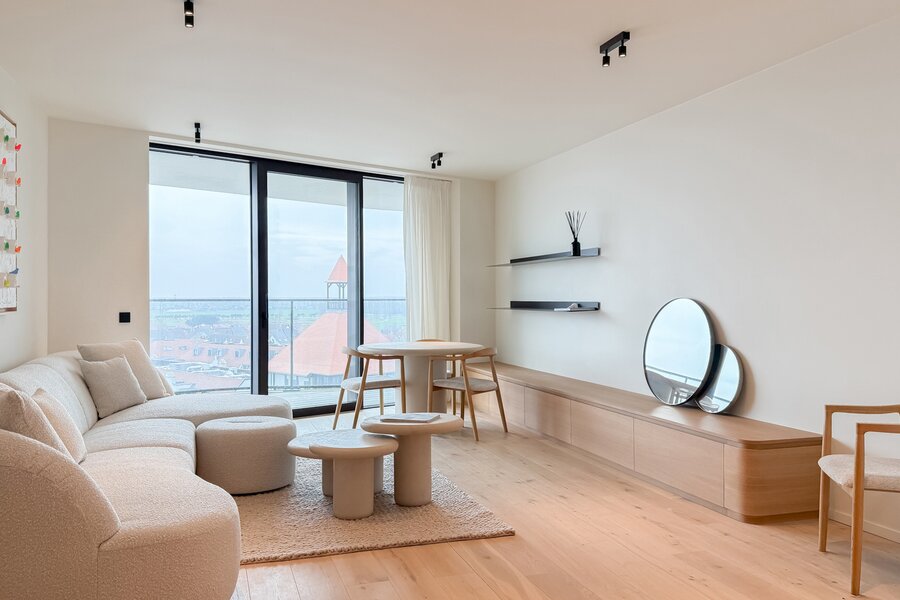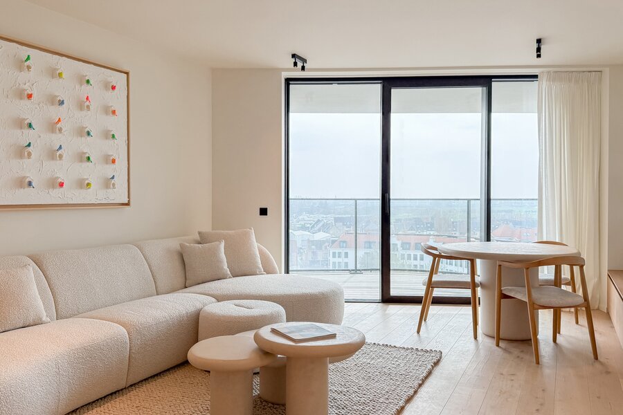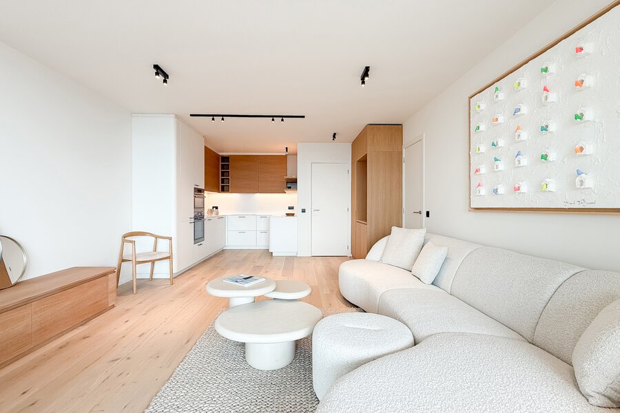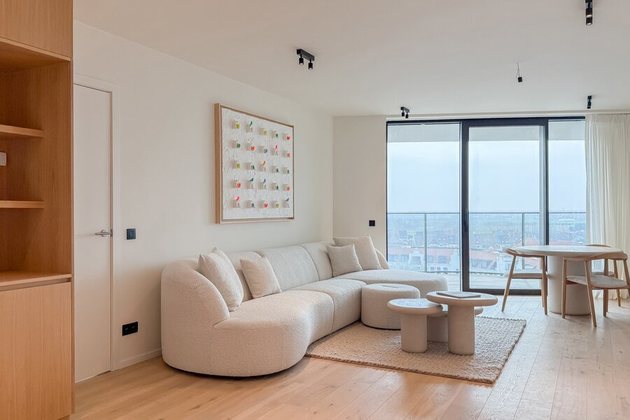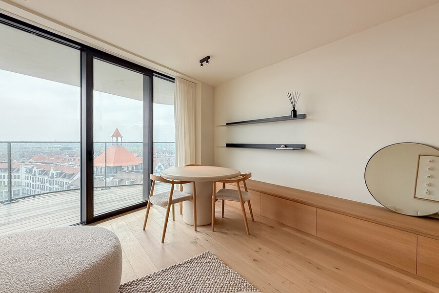 Cet élégant appartement allie confort, raffinement et situation exceptionnelle. Le séjour lumineux, à l’agencement ouvert et aux finitions haut de gamme, s’ouvre harmonieusement sur une spacieuse terrasse qui s’étend sur toute la largeur de l’appartement. Vous y profitez d’une vue panoramique à couper le souffle sur la skyline de Knokke-Heist.