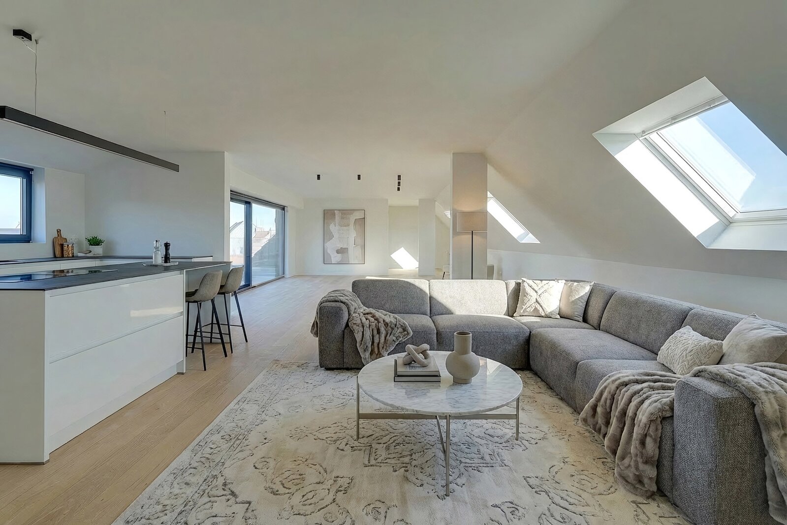 Situé au dernier étage d’une résidence contemporaine, ce penthouse exclusif séduit immédiatement par ses volumes, sa luminosité et la qualité de ses finitions.